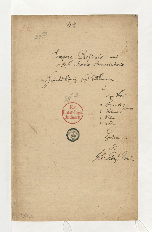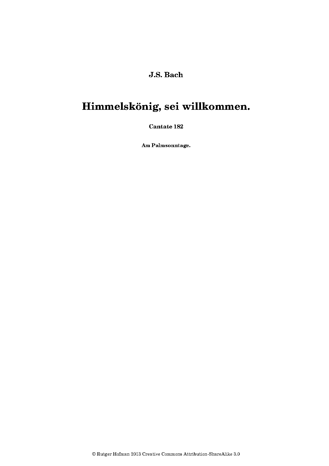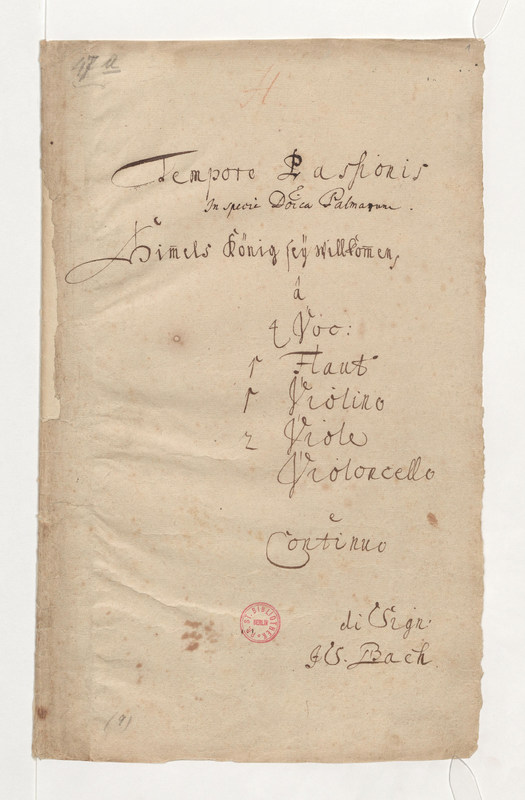 8 more: 2. Chorus: 'Himmelskönig, sei willkommen' • 3. Recitative: 'Siehe, ich komme, im Buch ist von mir geschrieben' • 4. Aria: 'Starkes Lieben' • 5. Aria: 'Leget euch dem Heiland unter' • 6. Aria: 'Jesu, laß durch Wohl und Weh' • 7. Chorus: 'Jesu, deine Passion ist mir lauter Freude' • 8. Chorale: 'So lasset uns gehen in Salem der Freuden' • Engraving files (MuseScore)
