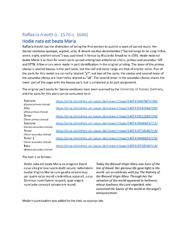 | Extra Information | The 7 parts are in two antiphonal choirs (SAT + STTB). The first woman to have her sacred music published, in Sacrae cantiones quinque, septem, octo, & decem vocibus decantanda (“Sacred songs to be sung in five, seven, eight, and ten voices”), published in Venice by Ricciardo Amadino in 1593. |