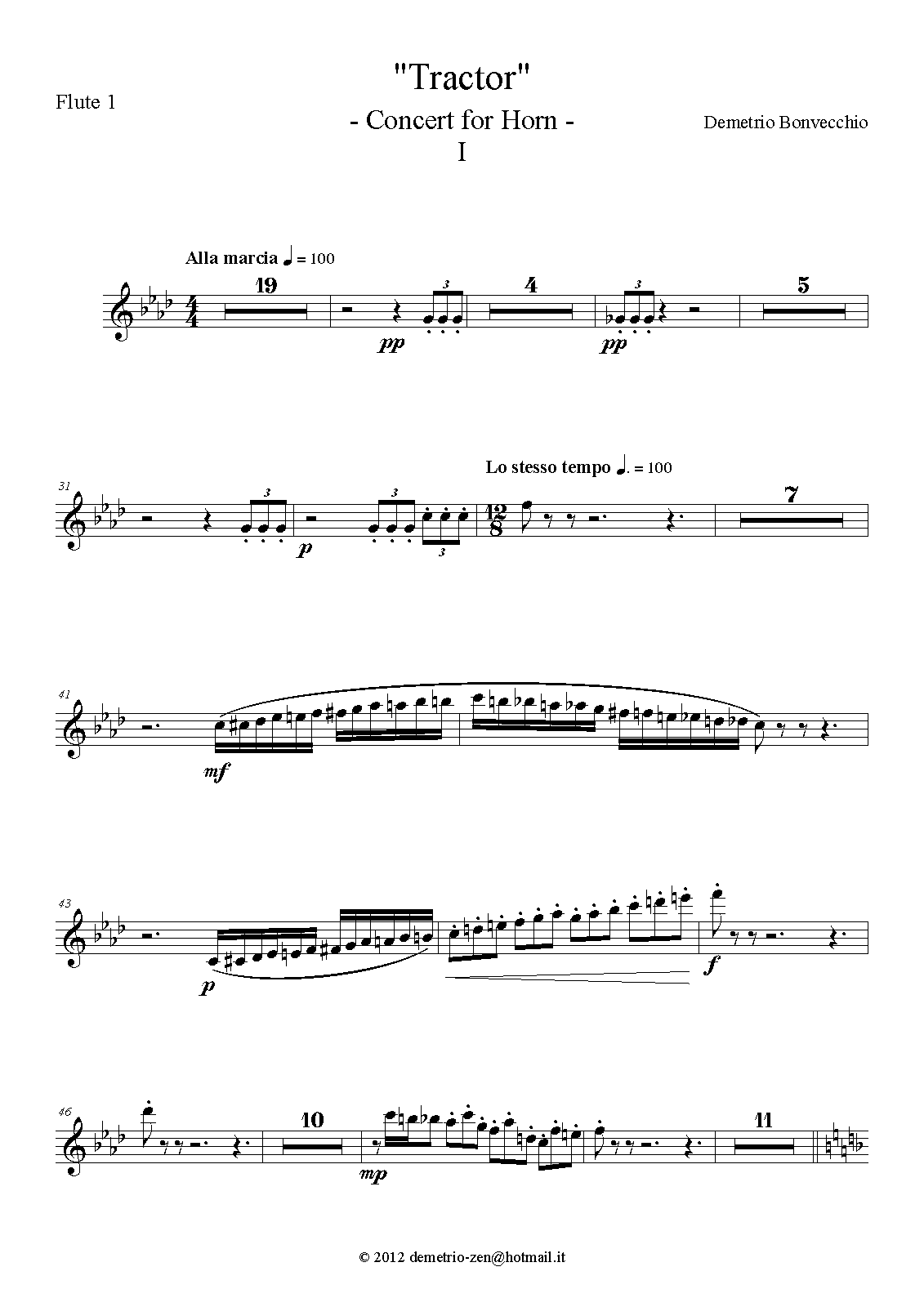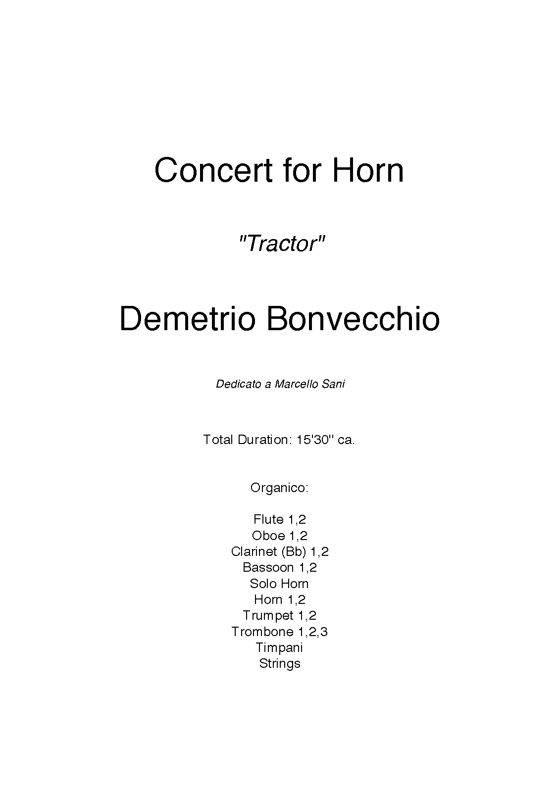 The solo horn part was written for a Bass Horn player, so it goes from the Pedal C (Pedal F in concert pitch) to the High A. "The Cadenza is only one example, feel free to extend it, improvise and have a good time!" Demetrio Bonvecchio