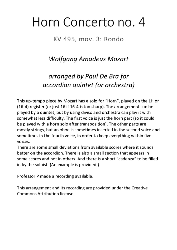 Misc. Notes Horn players often use the Mozart Concerti as recital pieces—with piano—but both the concerti and the pianists suffer as a result. The goal of this arrangement is to be logistically practical for a recital while providing an accompaniment that is both idiomatic and satisfying. The horn player should not view it as chamber music in the usual sense. The editor recommends that the horn player perform as a soloist, standing (or sitting) in front of the piano trio. The horn part is unedited and unchanged from Mozart's original.