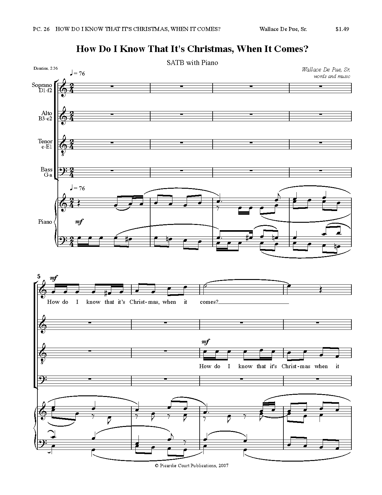 How Do I Know...(SATB / Piano) is a piece in binary form, that is, a peppy section followed by a legato section. It is composed by creating a contrary canon, at the fourth, and basing it on a cancrizan, (the music played against the backward version of itself). The music is fresh and bouncy and the melodies are likely to remain in the minds of those who sing it, as well as those who listen to it. This piece has never been premiered! It is of medium difficulty.