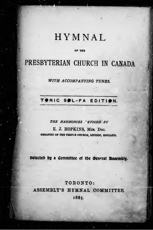 | Alternative. Title | Hymnal of the Presbyterian Church in Canada with accompanying tunes. The harmonies revised by E.J. Hopkins, Mus.Doc. organist of the Temple Church, London, England. Selected by a Committee of the General Assembly. |
