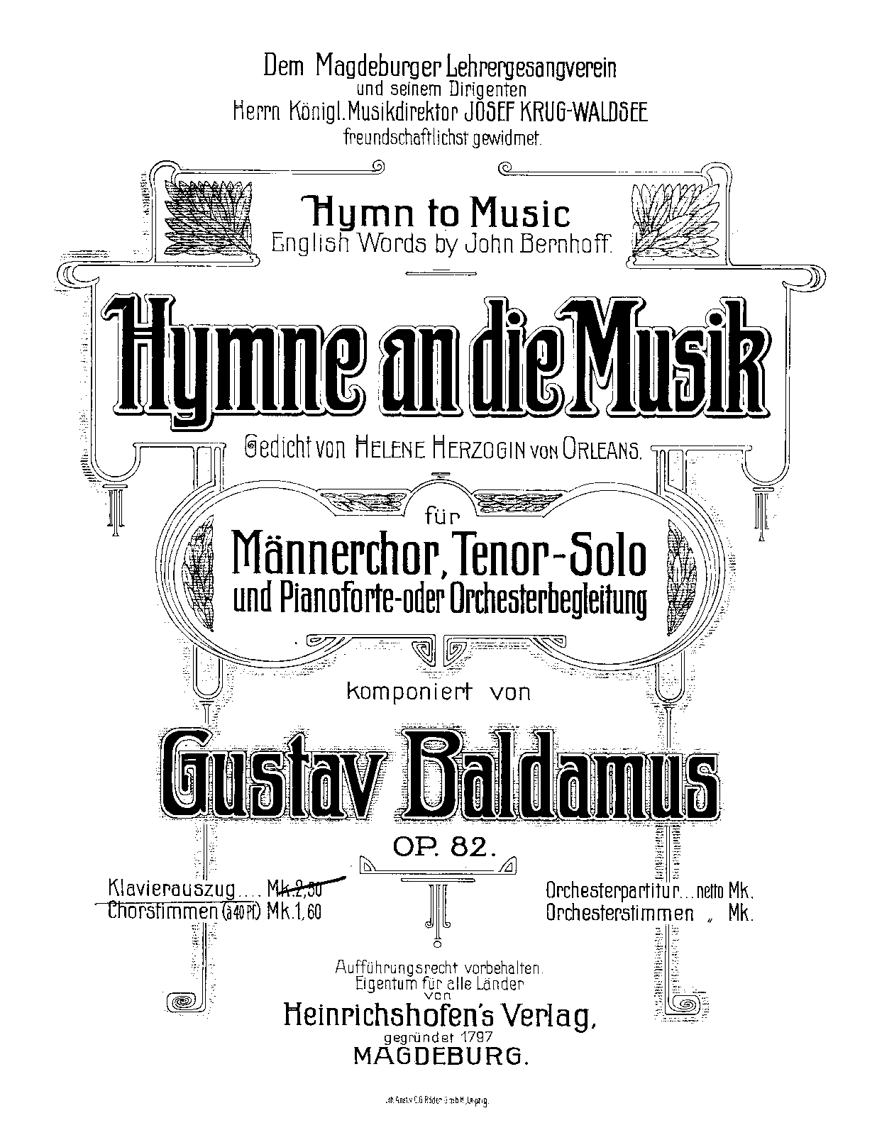 | Dedication | Dem Magdeburger Lehrergesangsverein und seinem Dirigenten Herrn Königl. Musikdirektor Josef Krug-Waldsee freundschaftlichst gewidmet |