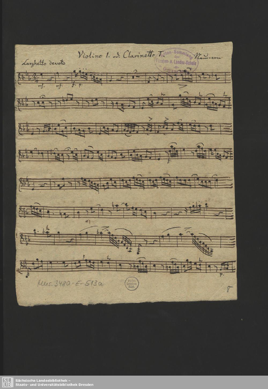 Parts: Violins (or Clarinets) 1 and 2 (clarinets parts in C and B♭), Viola, Violono (or Bassoon), 2 Horns in E♭, Keyboard. RISM 211004773.