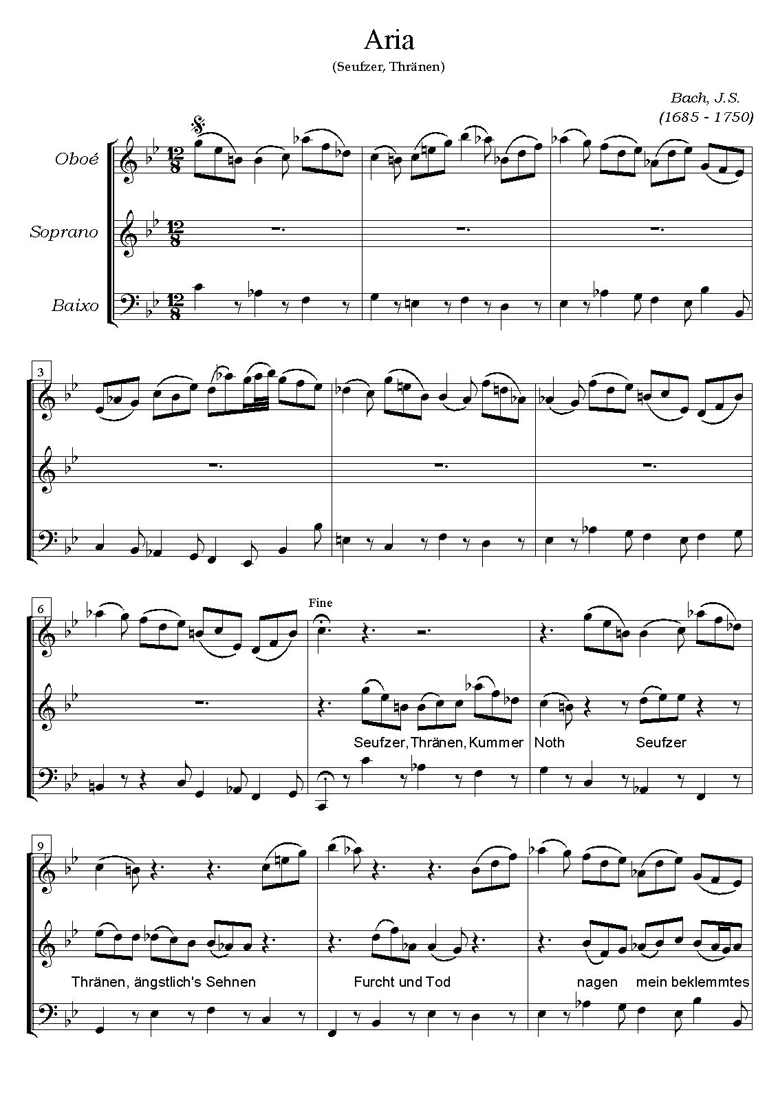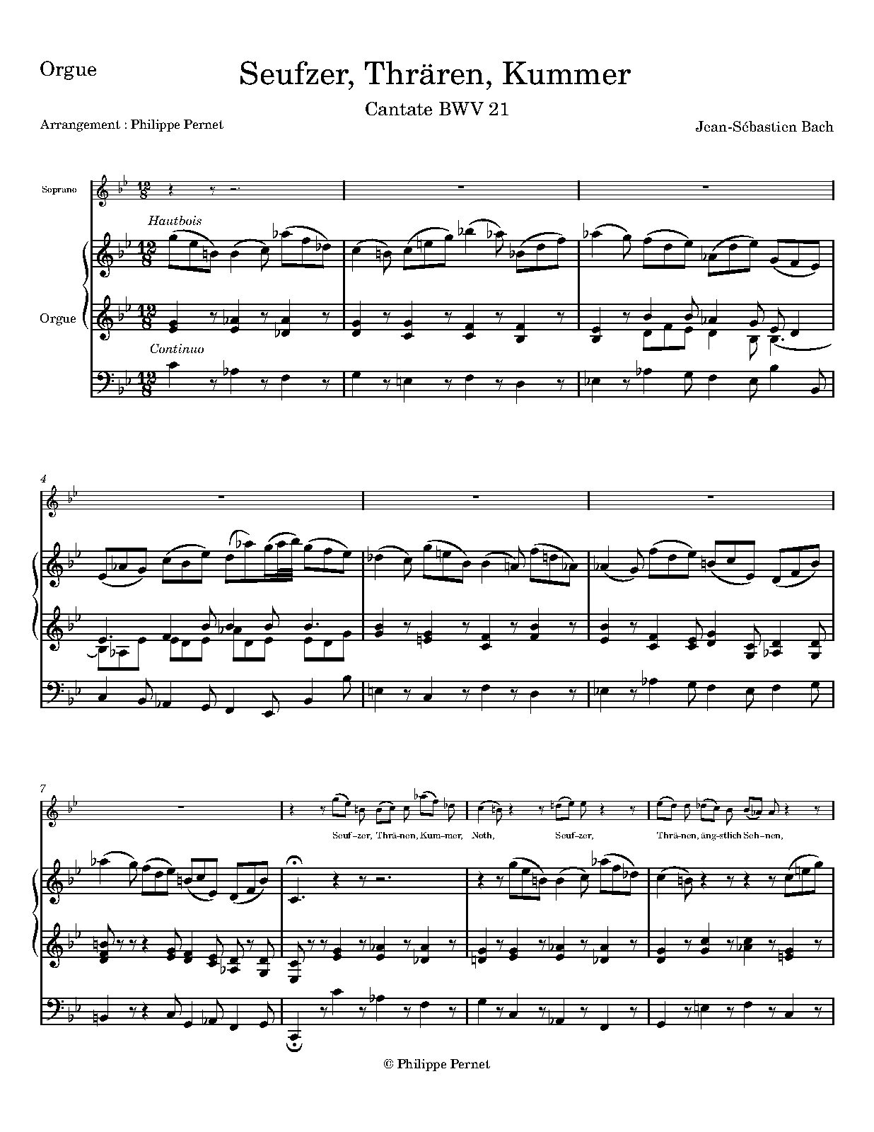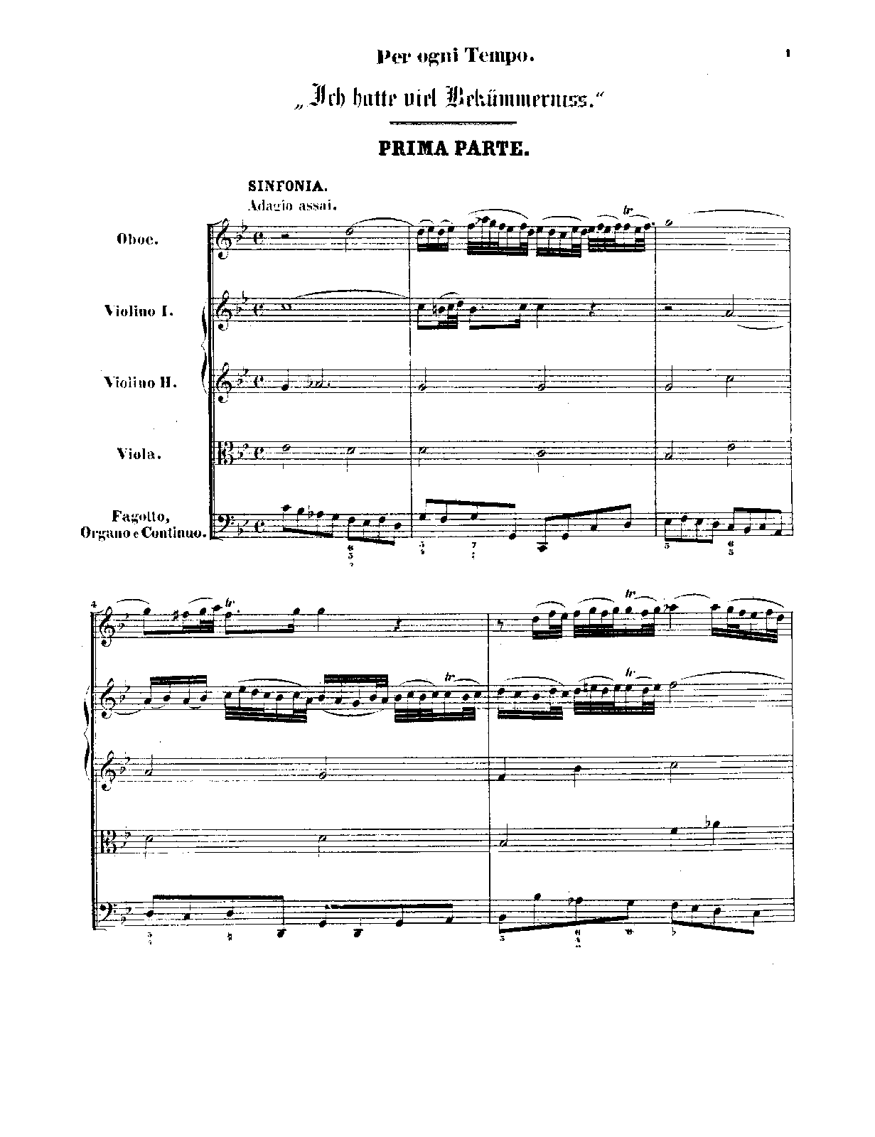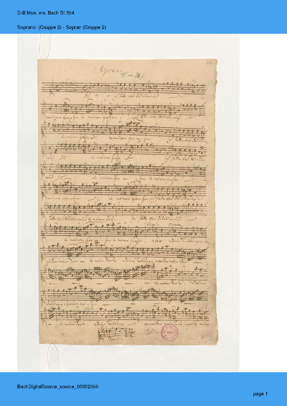 ⇒ 11 more: 2. Chorus: 'Ich hatte viel Bekümmernis in meinem Herzen' • 3. Aria: 'Seufzer, Tränen, Kummer, Not' • 4. Recitativo: 'Wie hast du dich, mein Gott' • 5. Aria: 'Bäche von gesalznen Zähren' • 6. Chorus: 'Was betrübst du dich, meine Seele' • 7. Recitativo: 'Ach Jesu, meine Ruh' • 8. Duet Aria: 'Komm, mein Jesu, und erquicke; Ja, ich komme und erquicke' • 9. Chorus (+Chorale): 'Sei nun wieder zufrieden, meine Seele' • 10. Aria: 'Erfreue dich, Seele, erfreue dich, Herze' • 11. Chorus: 'Das Lamm, das erwürget ist' • Engraving files (MuseScore)