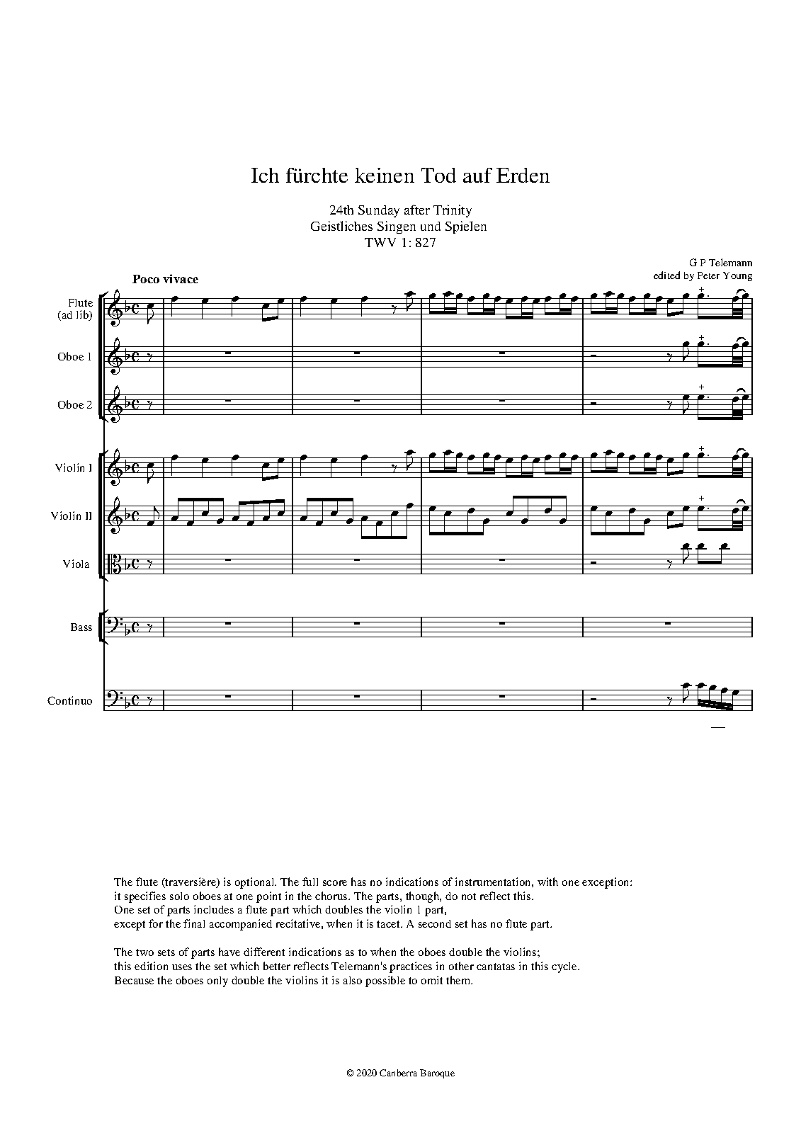 Voices: soprano, tenor, bass; mixed chorus (SATB) Orchestra: flute (optional), 2 oboes, strings, continuo