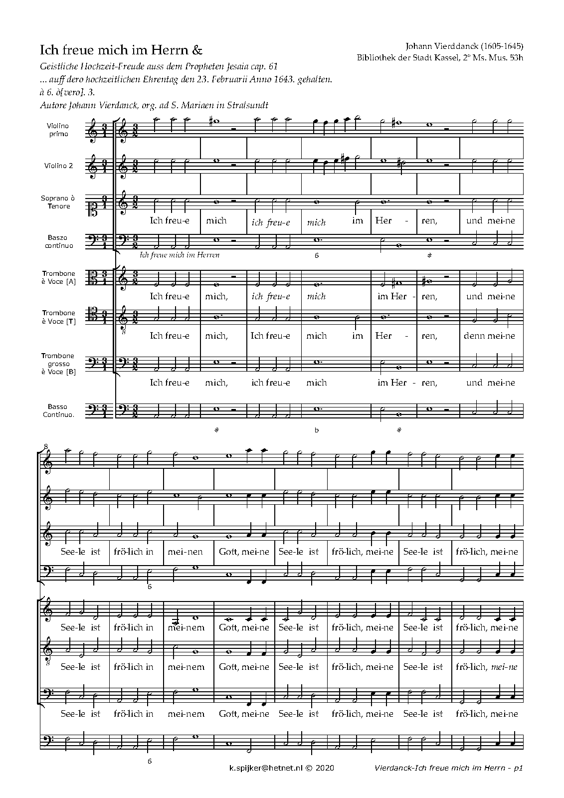 | Instrumentation | Kassel manuscript: soprano (or tenor), 2 violins, continuo; 3 trombones (ad lib.) and ATB voices Jakob Jeger print: soprano (or tenor), 2 violins, continuo |