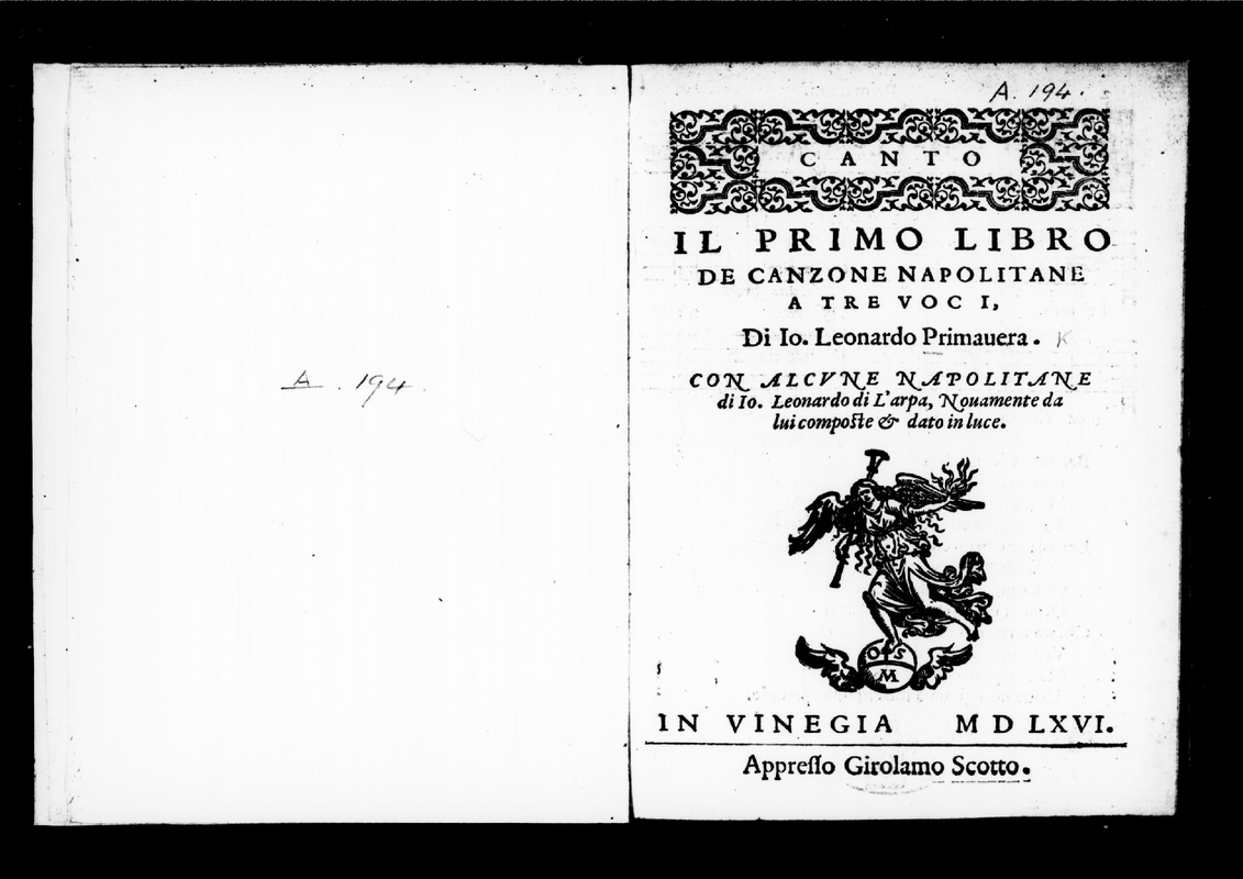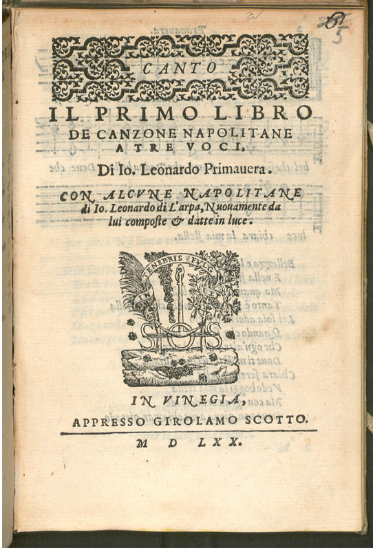 Il primo libro de canzone napolitane a tre voci, di Jo. Leonardo Primavera. Con alcune Napolitane di Jo. Leonardo di l’arpa, novamente da lui composte & dato in luce.