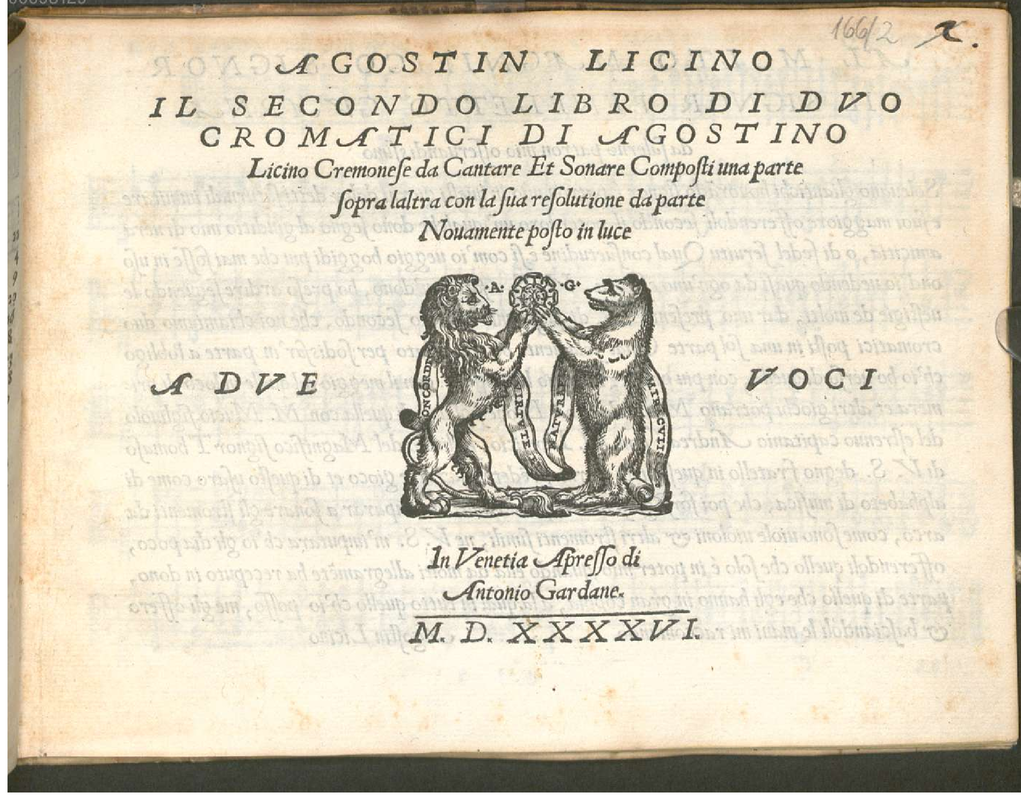 | Alternative. Title | Il secondo libro di duo cromatici di Agostino Licino cremonese da cantare et sonare composti una parte sopra laltra con la sua resolutine da parte[.] Novamente posto in luce |