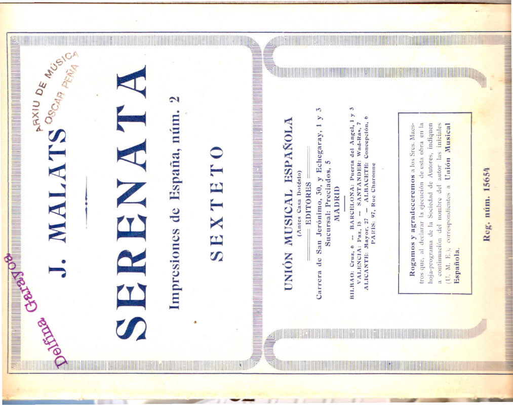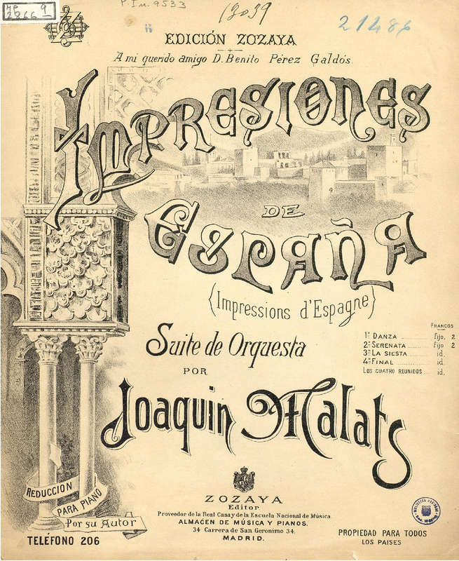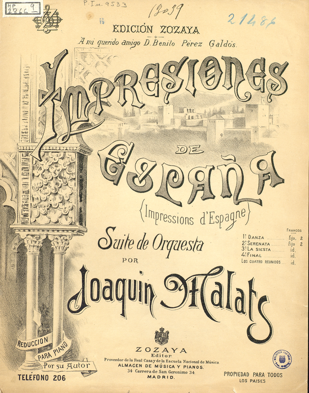 | Extra Information | Published for piano, strings or full orchestra. BDH claims a publication date of 1896 for the solo piano version published by Zozaya. Also, note on the cover the mention of four movements instead of just the first two. It is unclear if the piano version is the original or if one of the others is. |
