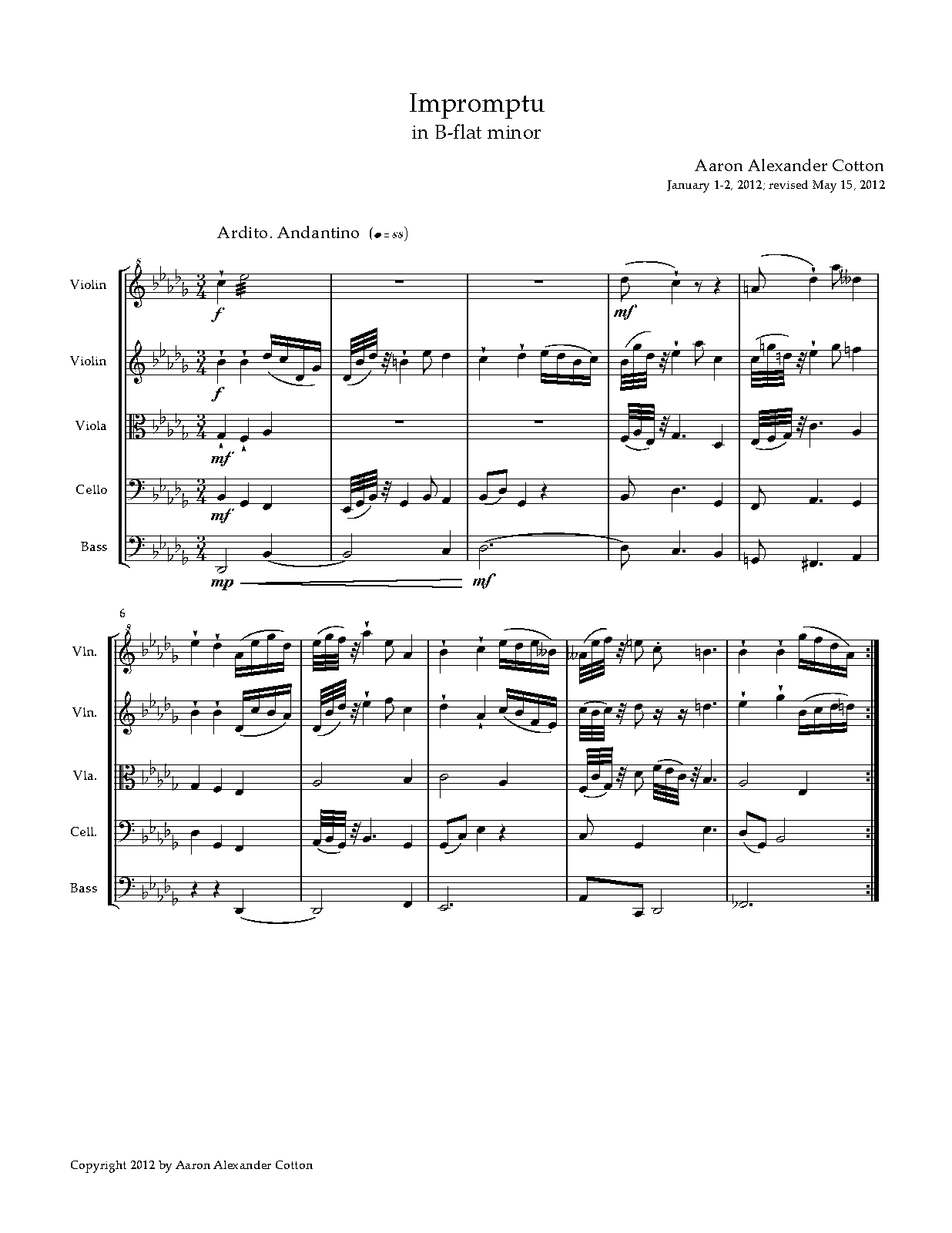 | Genre Categories | Impromptus; For 2 violins, viola, cello, double bass; Scores featuring the violin; |