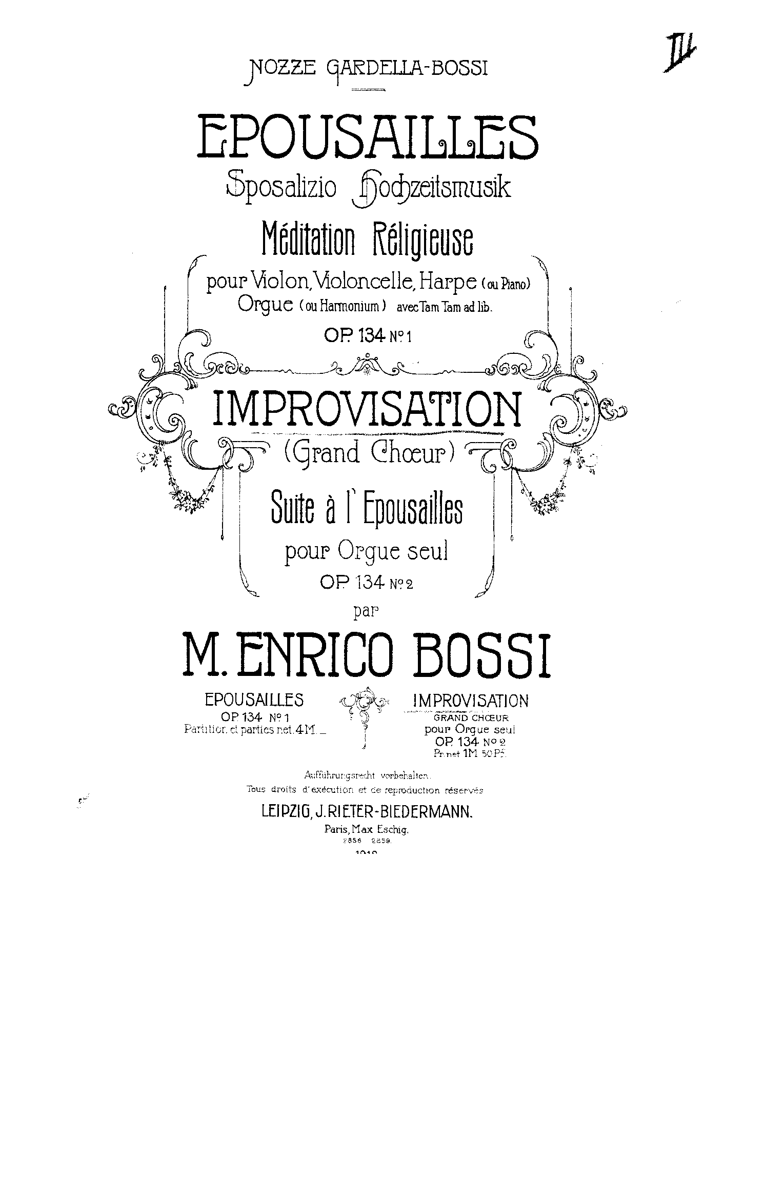 Op.134 No.1 is Épousailles (Hochzeitsmusik), "méditation réligieuse pour v. (voice or violin??), vcelle., harpe (ou piano), org. (ou harm.), av. tam tam (ad lib.)" - see Monatsbericht (1912), p.66.