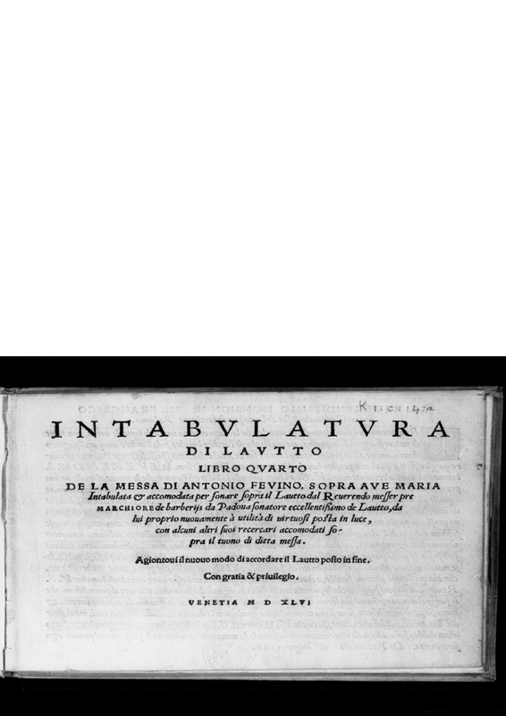| Alternative. Title | Intabulatura di lautto libro quarto de la messa di Antonio Fevino sopra Ave Maria Intabulata & accomodata per sonare sopra il Lautto dal Reverendo messer pre Marchiore de barberijs da Padova sonatore eccellentissimo de Lautto, da lui proprio nouamente a utilita di virtuosi posta in luce, con alcuni altri suoi recercari accomodati sopra il tuono di ditta messa. Agiontovi il nuovo modo di accordare il Lautto posto in fine. |