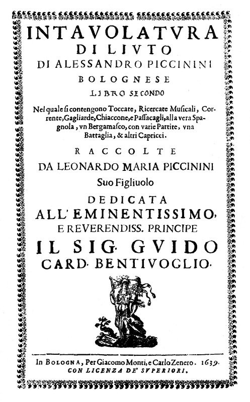 | Alternative. Title | Intavolatvra di livto di Alessandro Piccinini Bolognese libro secondo nel quale si contengono Toccate, Ricercate Musicali, Corrente, Gagliarde, Chiaccone, e Passacagli, alla vera Spagnola, vn Bergamasco, con varie Partite, vna Battaglia, & altri Capricci |