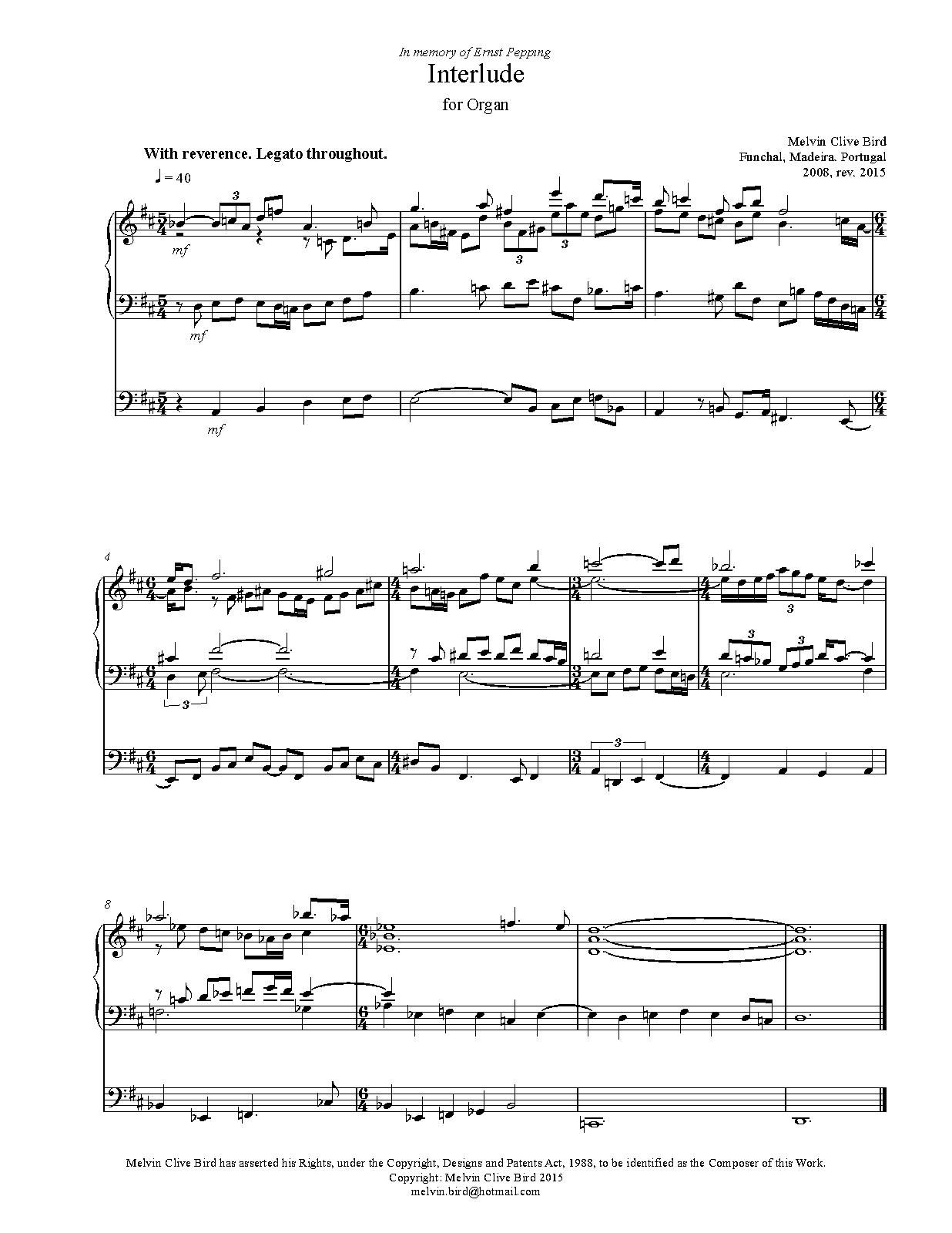 The Composer welcomes performances and recordings of this Work. Please contact the Composer for further information. melvin.bird@hotmail.com