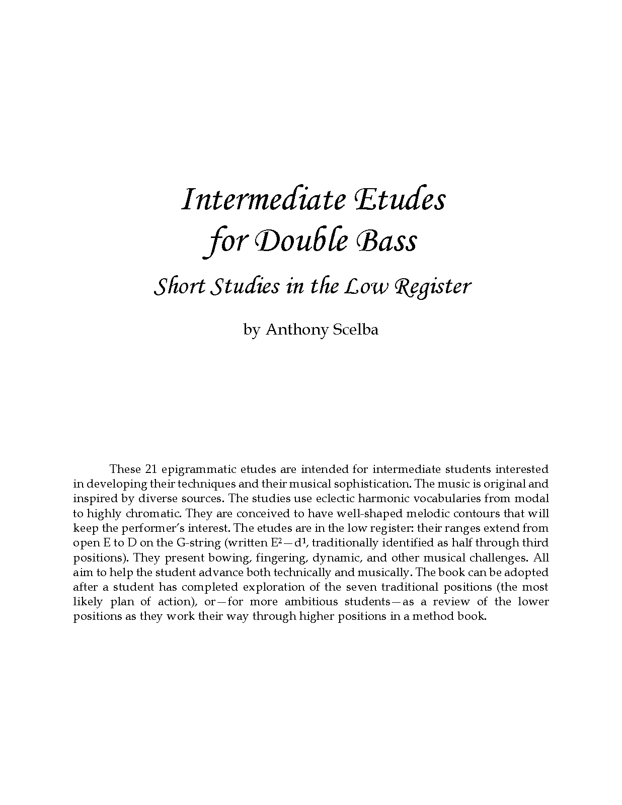 21 epigrammatic etudes intended for intermediate students interested in developing their techniques and their musical sophistication. The music is original and inspired by diverse sources. The studies use eclectic harmonic vocabularies from modal to highly chromatic. They are conceived to have well-shaped melodic contours that will keep the performer’s interest. The etudes are in the low register: their ranges extend from open E to D on the G-string (written E2—d1, traditionally identified as half through third positions). They present bowing, fingering, dynamic, and other musical challenges.