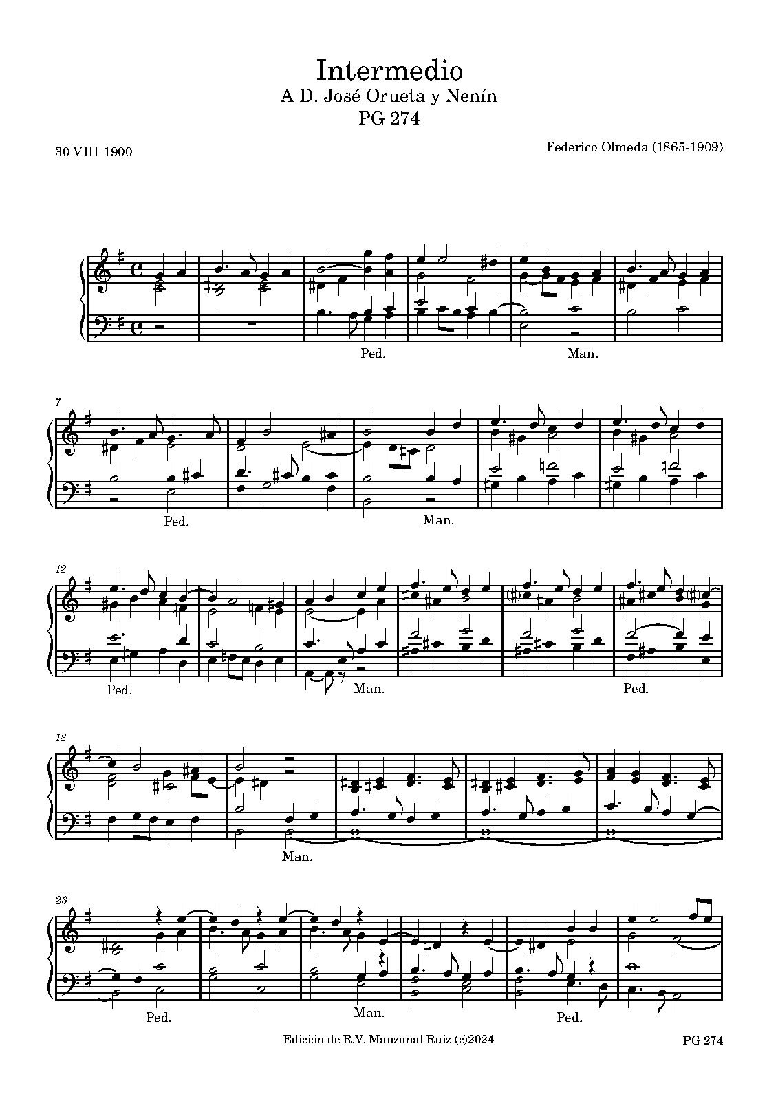 This work relates to number 274 according to catalog by Miguel Ángel Palacios Garoz (listed on "Federico Olmeda, un maestro de capilla atípico" by Miguel Ángel Palacios Garoz, 2003, ISBN 84-87876-90-0 pg 346). Edition has been done by using the manuscript from the "Archivo de la Diputación de Burgos - Fondo Olmeda", box 4, kindly provided by the Archive and by Mr. Rodrigo CALZADA.
