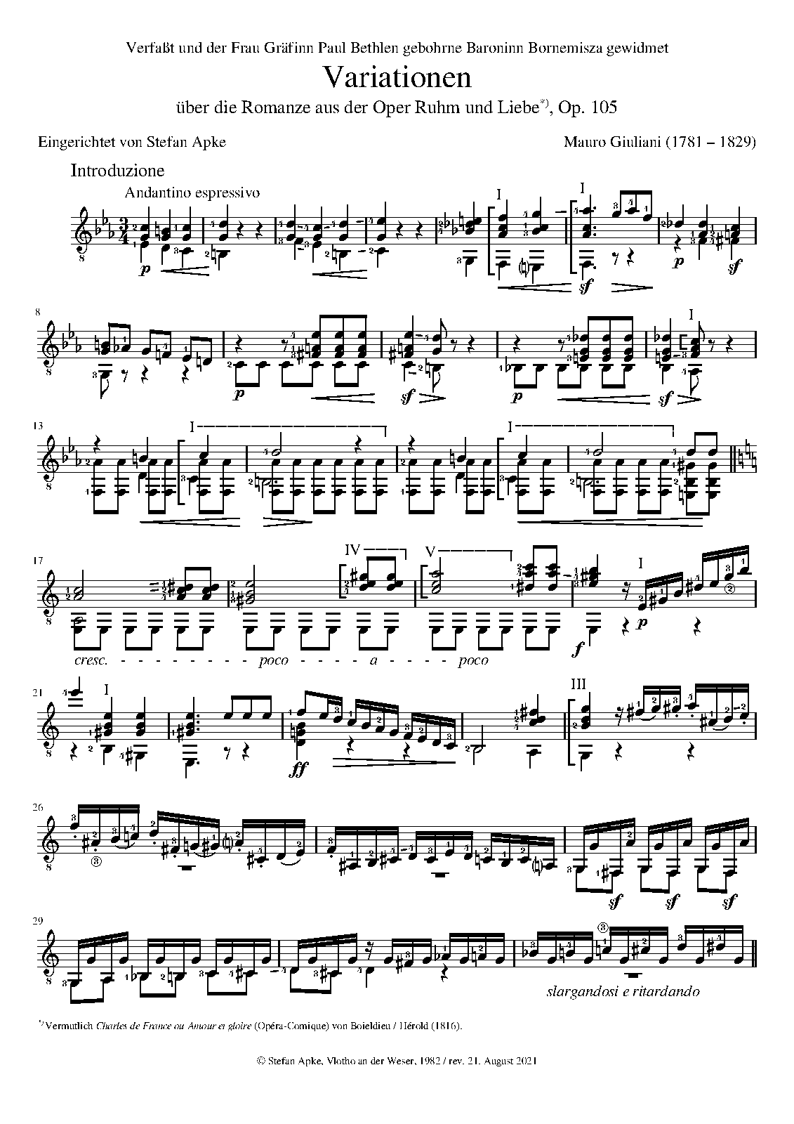 | Alternative. Title | Variations sur une Romance favorite de l'Opera La Gloire et L'Amour |