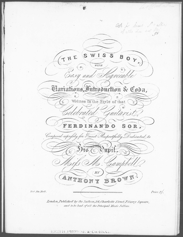 | Alternative. Title | The Swiss Boy, with Easy and Agreeable Variations, Introduction & Coda, Written in the Style of that Celebrated Guitarist, Ferdinando Sor |