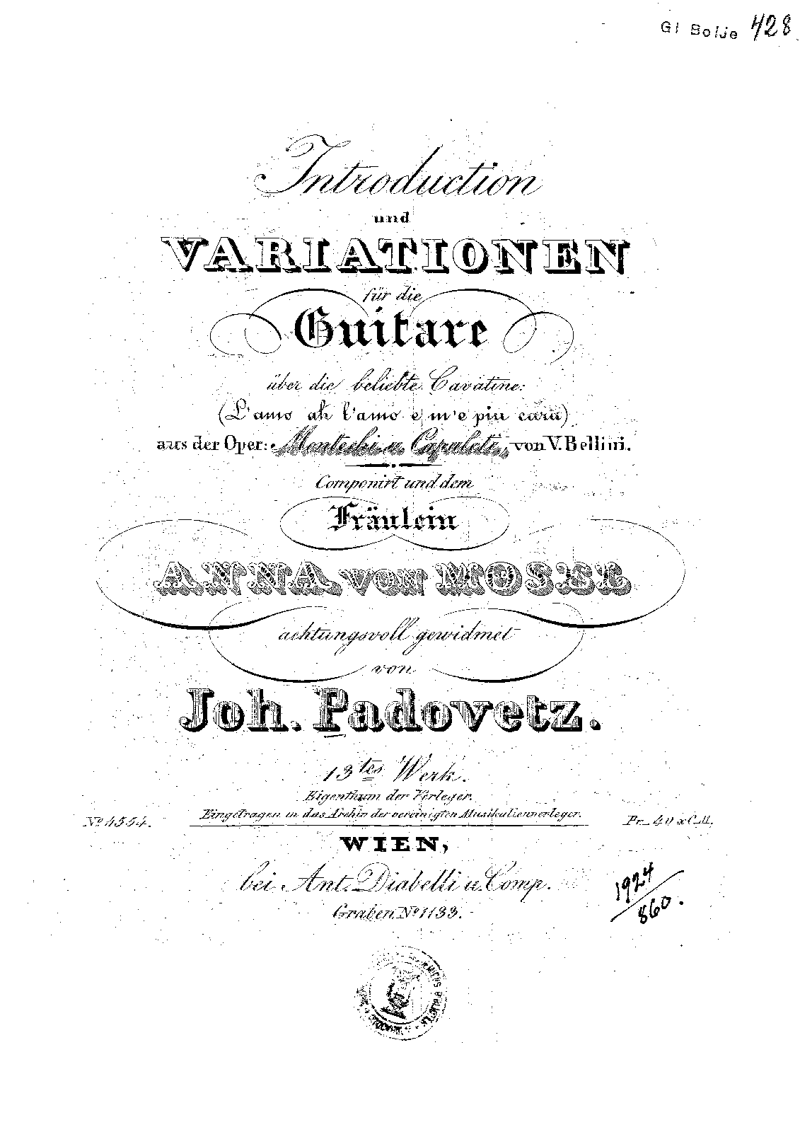 | Alternative. Title | Introduktion und Variationen für die Guitarre über die beliebte Cavatine: (L'amo ah l'amo e m'e piu cara) aus der Oper: Montechi u. Capoleti von V. Bellini |