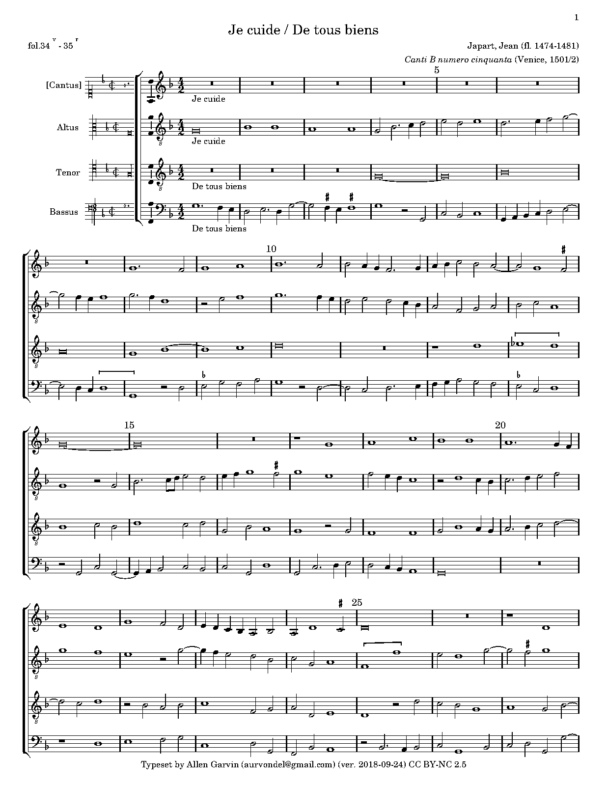 A combinative chanson consisting of De tous biens plaine in the tenor & bass, and Je cuide se ce temps me dure in the treble and alto. Other settings of the latter exist, but no full text has been found. The former exists in literally dozens of settings.