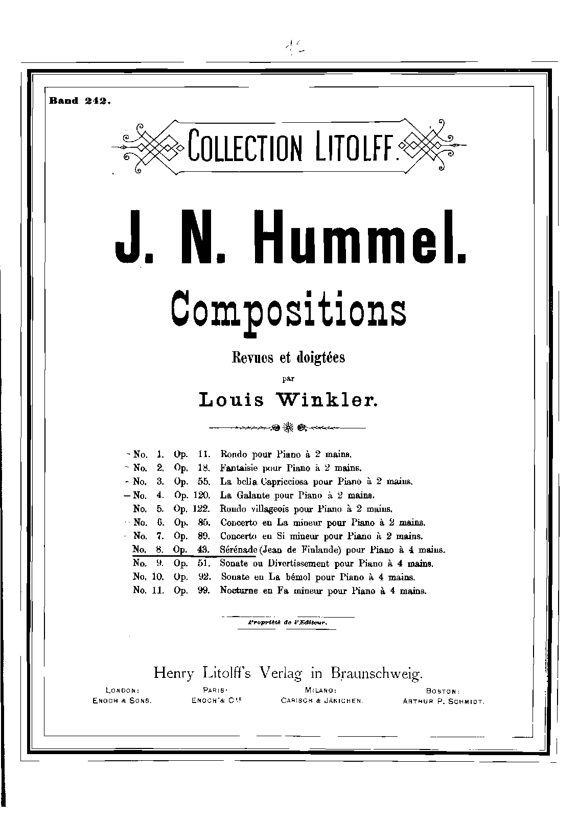 Hummel Clavierstücke, No.8 Braunschweig: Henry Litolff's Verlag, No. 242, n.d.(ca.1890). Plate 3280.