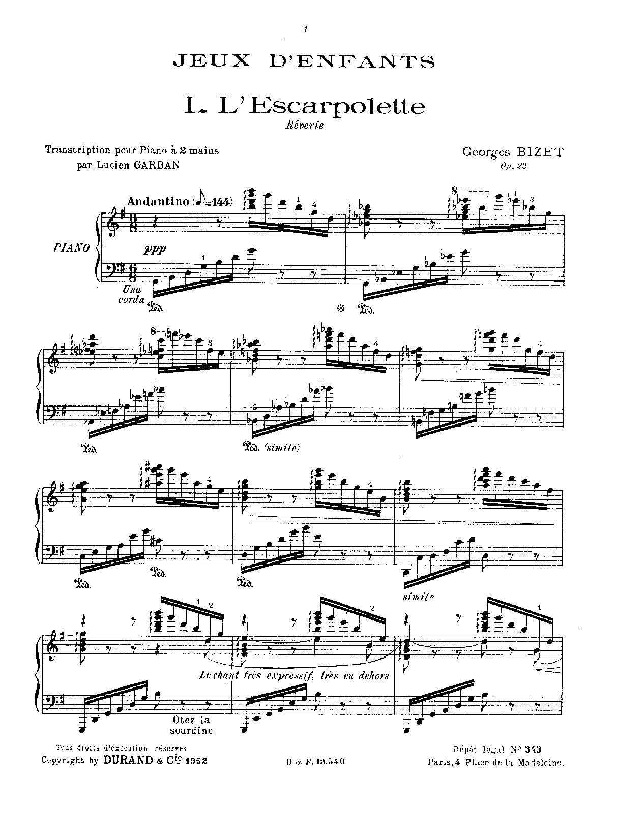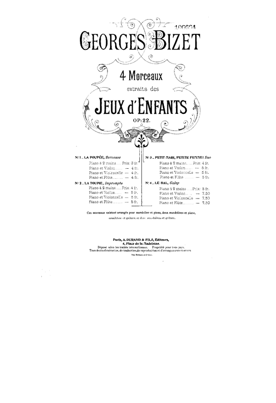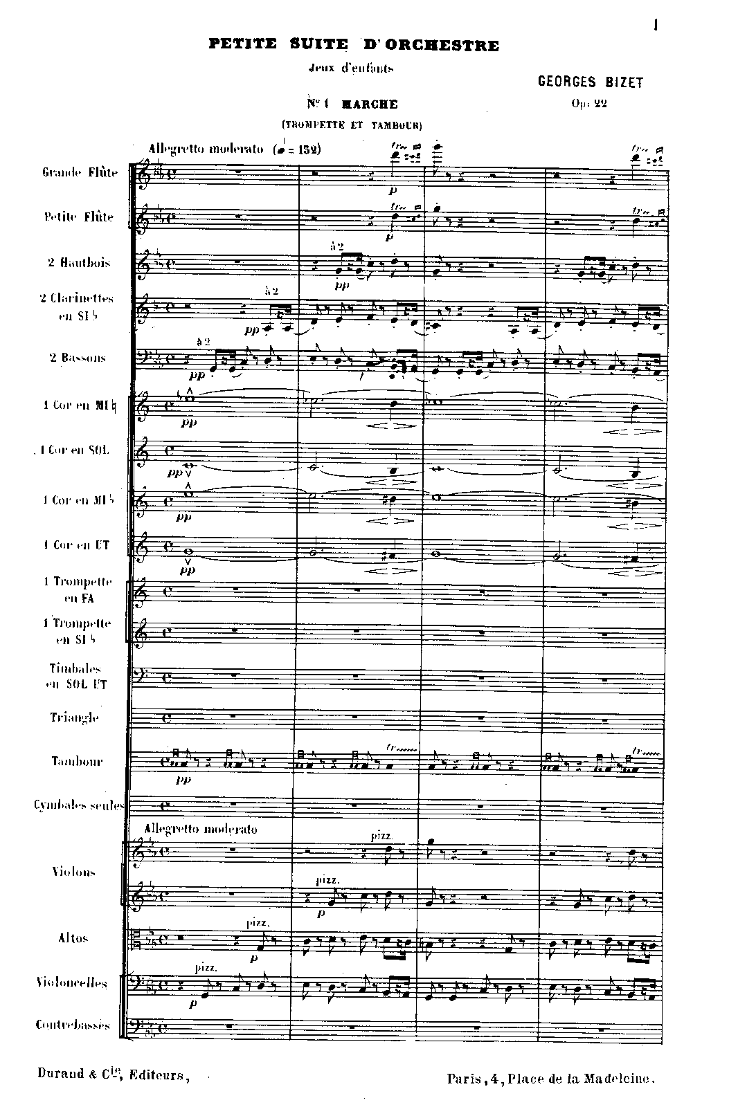 | Extra Information | Nos. 2, 3, 6, 11, 12 were orchestrated by Bizet to form the Suite, but in the order 1) Marche (Trompette et Tambour, no.6), 2) Berceuse (La Poupée, no.3), 3) Impromptu (La Toupie, no.2), 4) Duo (Petit Mari, Petite Femme!, no.11), 5) Galop (Le Bal, no.12). Trompette et Tambour was also transposed from B minor into C minor. |