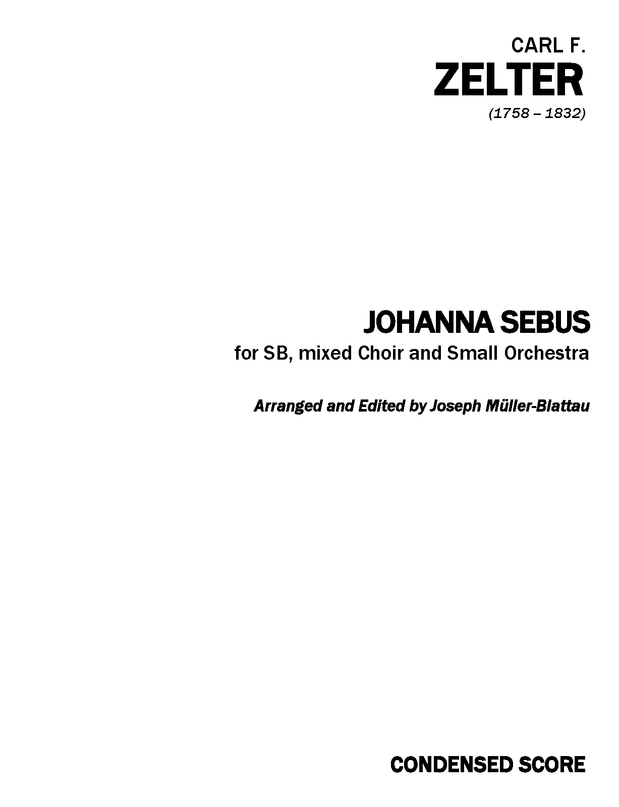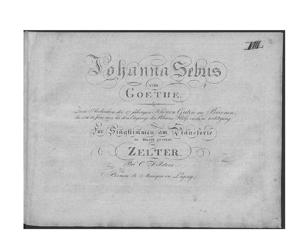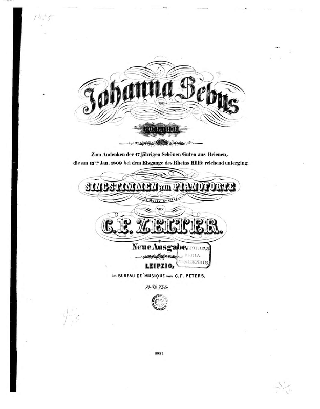 Johanna Sebus von Goethe. Zum Andenken der 17 jaehrigen Schoenen Guten aus Brienen, die am 13ten Jan. 1809 bei dem Eisgange des Rheins Huelfe reichend unterging. Fuer Singstimmen am Pianoforte in Musik gesetzt von C. F. Zelter</span>