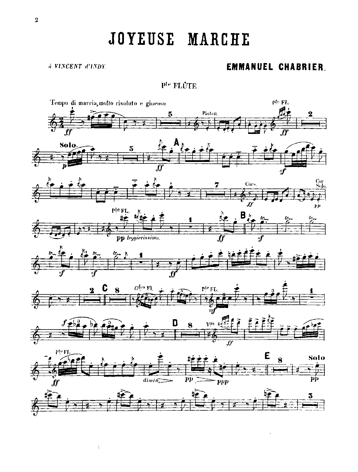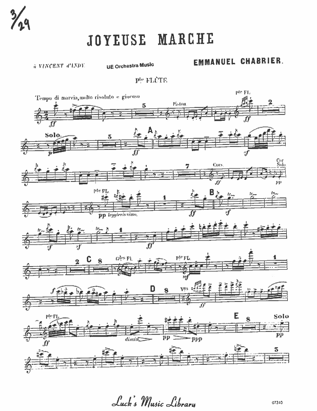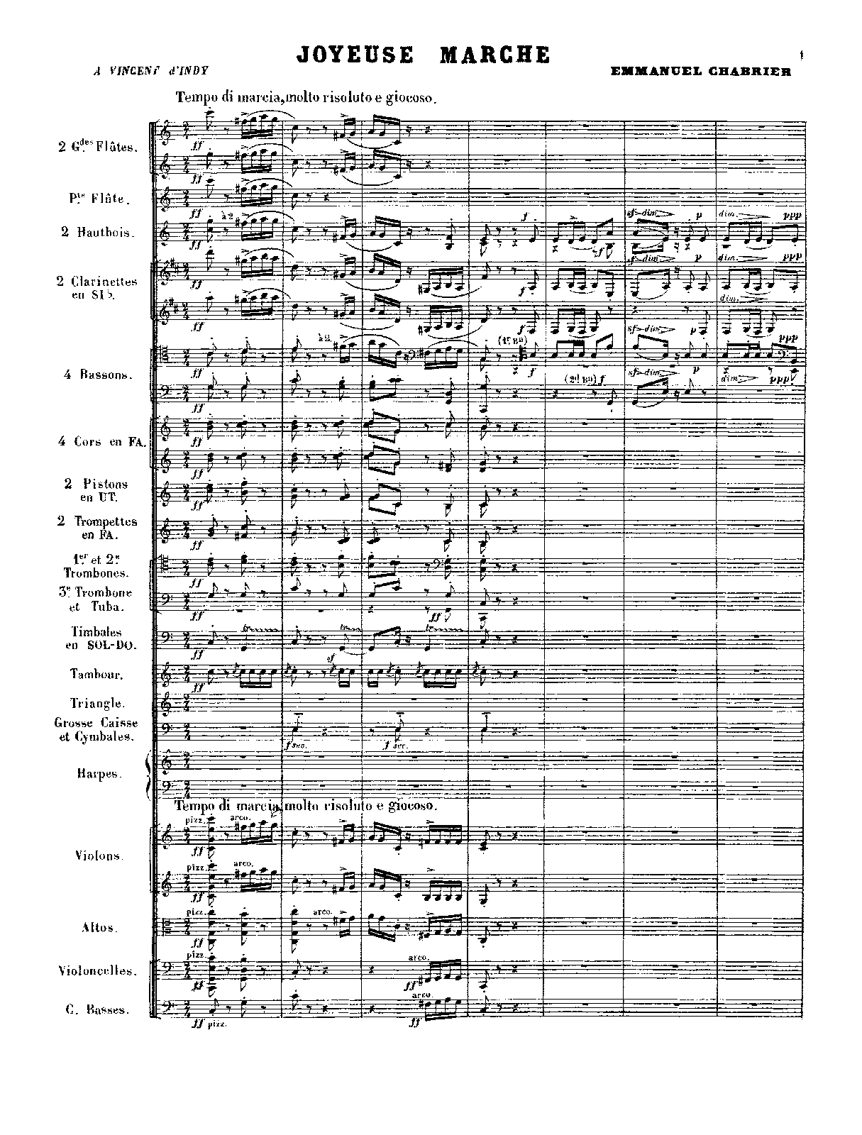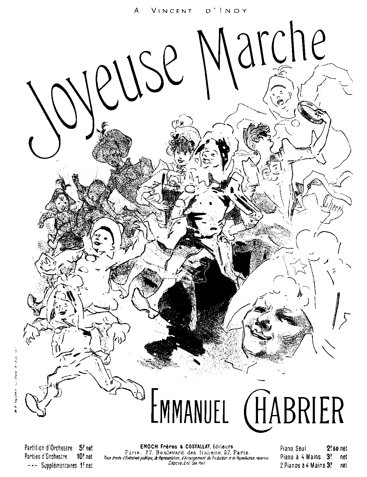 | Extra Information | According to Delage, Chabrier transcribed the original (for piano 4-hands) for orchestra, and also for piano solo. The 1883 composition date is conjectural as no performance of the piano duet is recorded until 1892, though Delage mentions a Prélude et marche française from May 1885. |