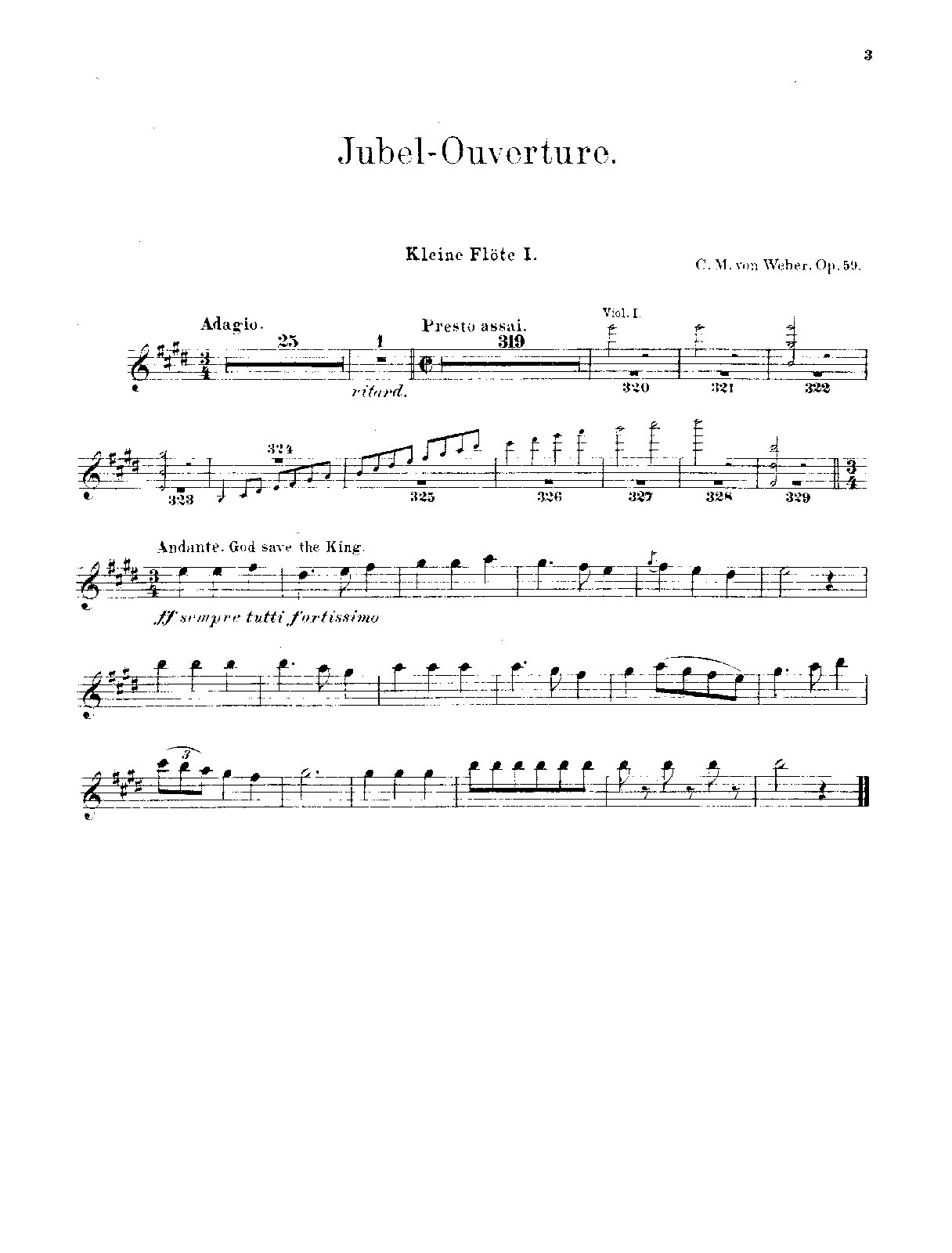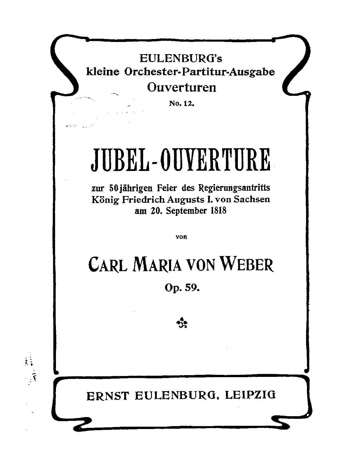 Extra Information Composed for the festival held at Dresden in commemoration of the 50th anniversary of the accession of Frederick Augustus I. of Saxony. The autograph is dated Dresden, Sept. 11, 1818, and the first performance was at the Court Theatre on Sept. 20. The overture winds up with 'God save the King.' Weber had written a Jubel cantata for the occasion, but it was put aside, and the overture—an entirely independent work—performed instead.' (Wikisource)