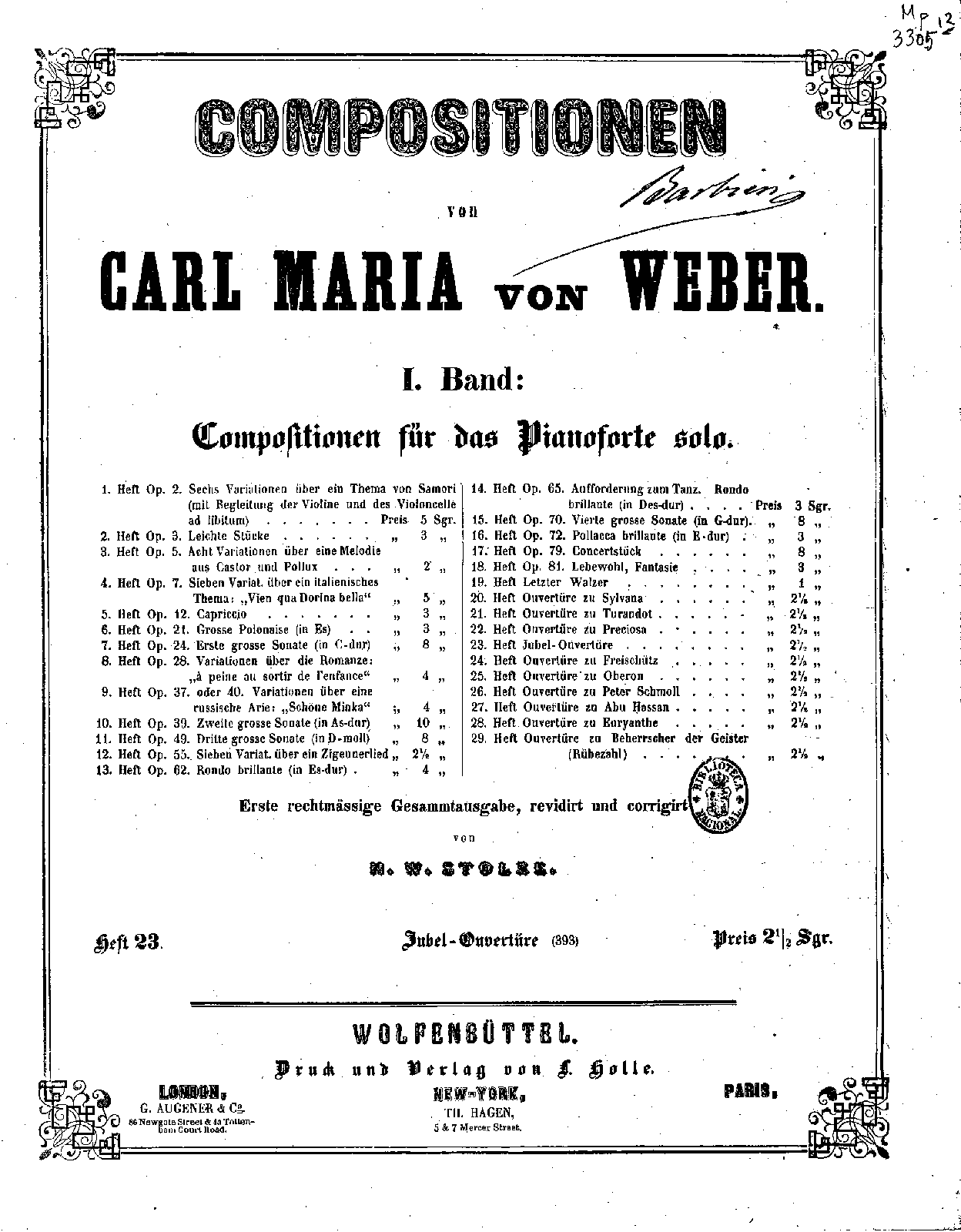 Publisher. Info. Compositionen von Carl Maria von Weber, Band I, heft 23
