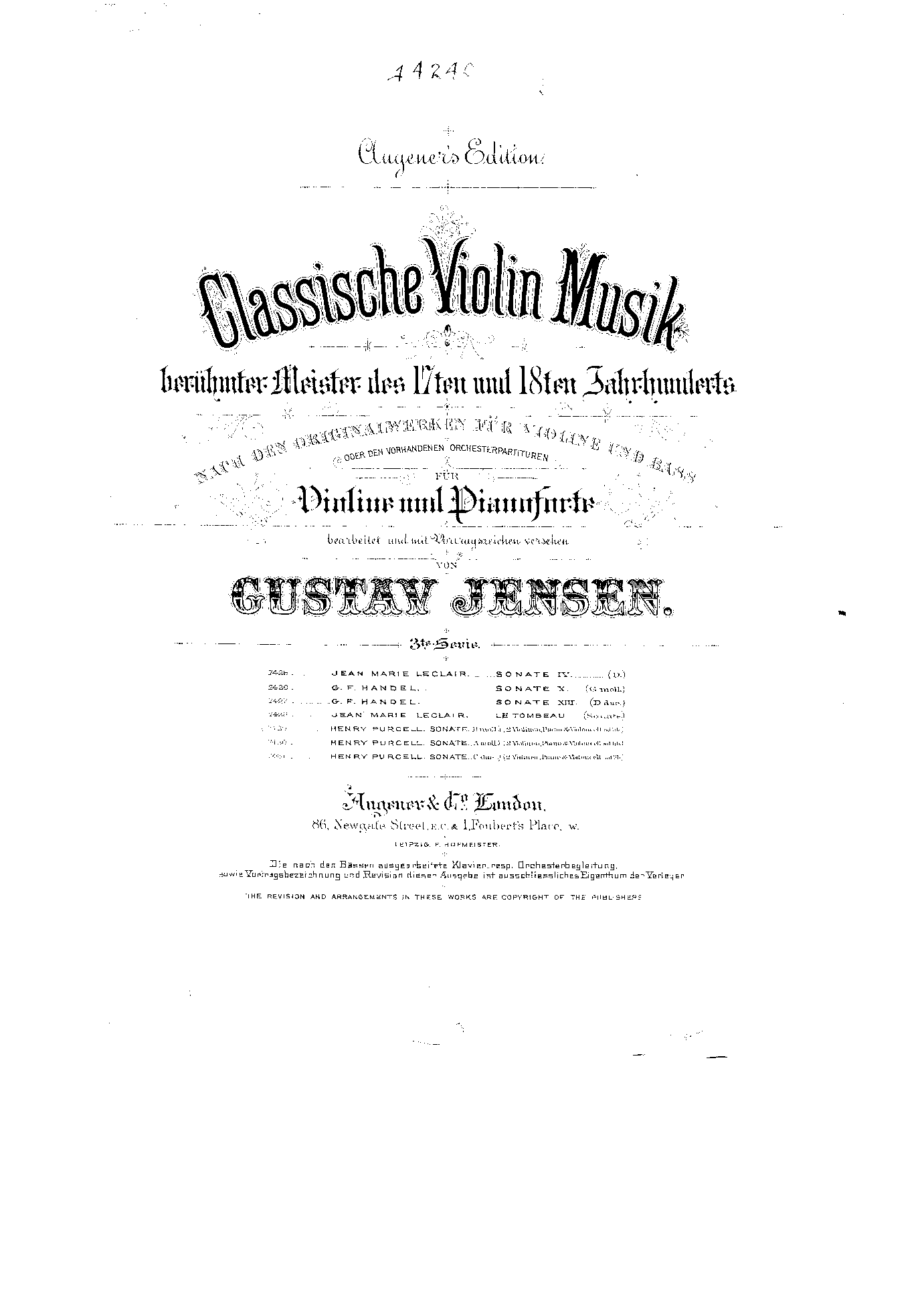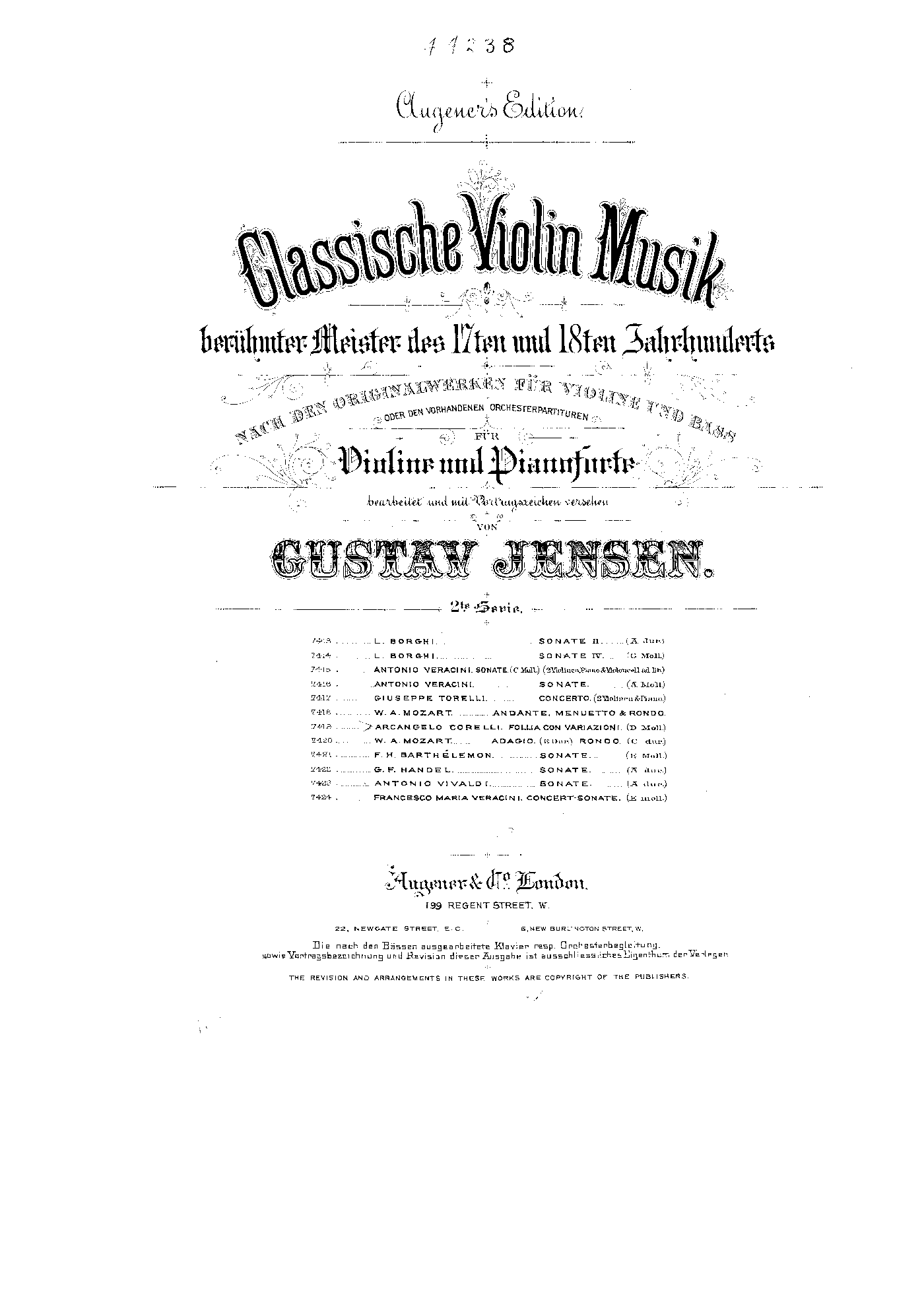 Klassische Violinmusik berühmter Meister des 17. u. 18. Jahrh. Nach den Originalwerken f. V. u, B. beziffert u. unbeziffert f. V. u. Pfte bearb. u. m. Vortragszeichen versehen.