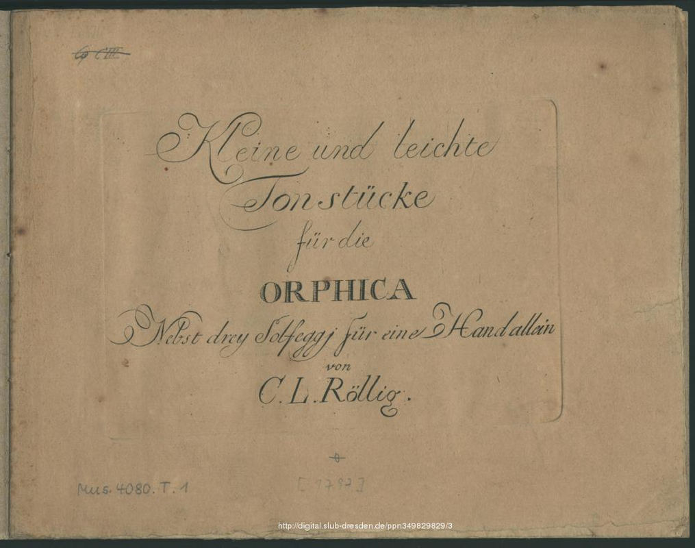 | Alternative. Title | Kleine und leichte Tonstücke für die Orphica nebst drey Solfeggi für eine Hand allein von C. L. Röllig. |