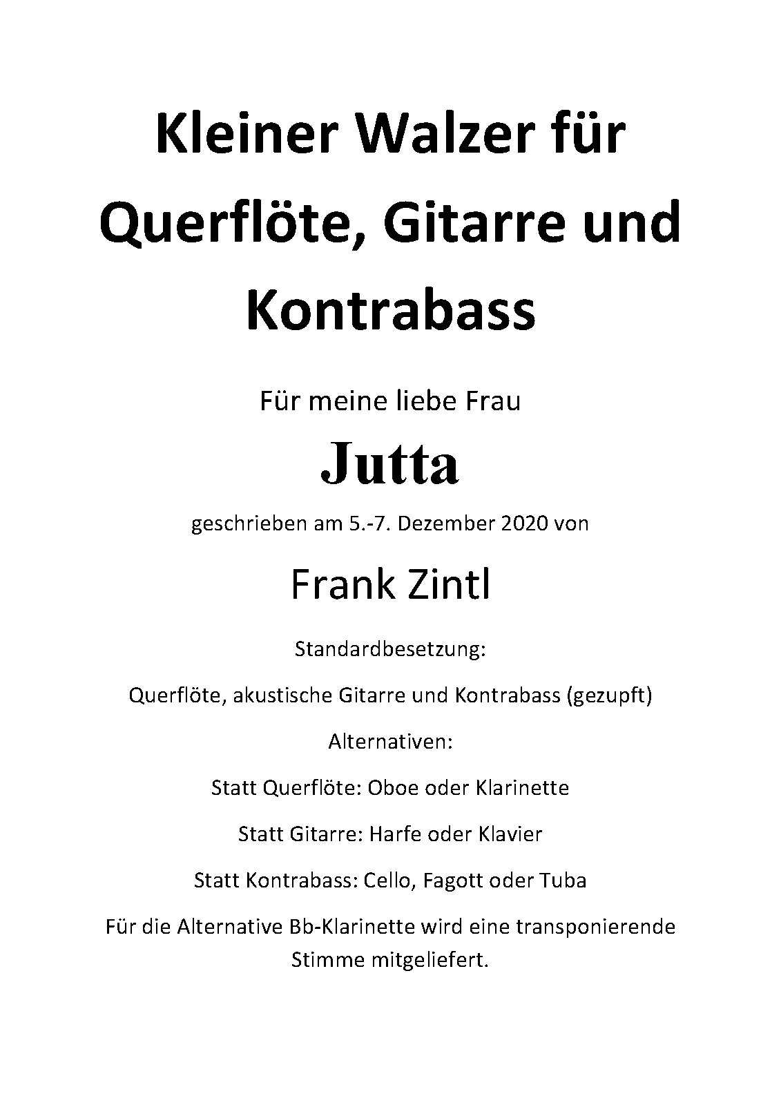 The instruments are changeable. The flute may be replaced by an oboe or a clarinet. The nylon guitar can be replaced by a harp or piano. The double bass can be replaced by a violoncello (plucked), a bassoon or a tuba. For clarinet players a transposing part for Bb instrument is included.