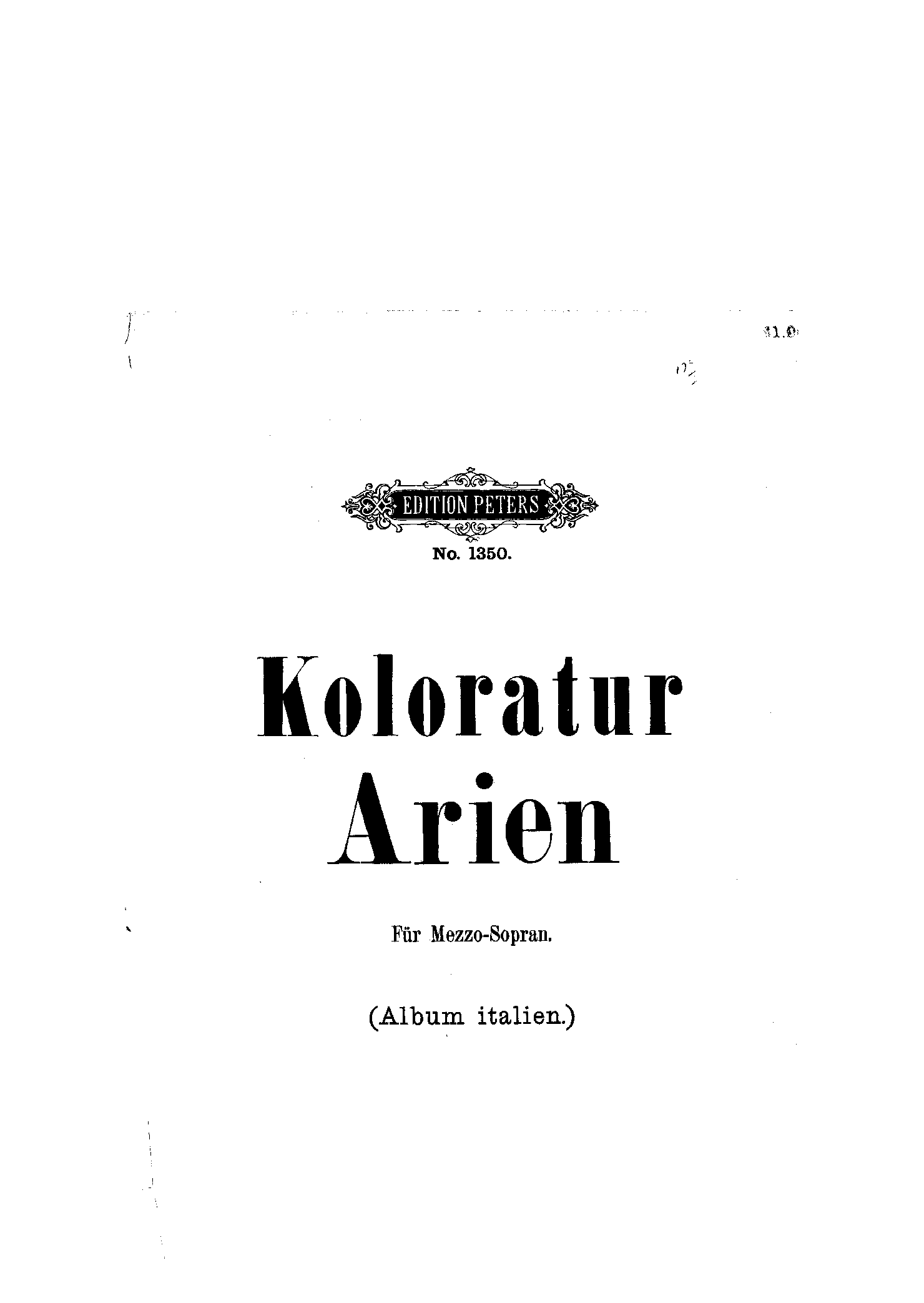 Alternative. Title Sammlung italienischer Koloratur-Arien für Mezzo-Sopran mit Pianofortebegleitung; Italian Album for Mezzo contains Arias by Mozart, Bellini and Rossini