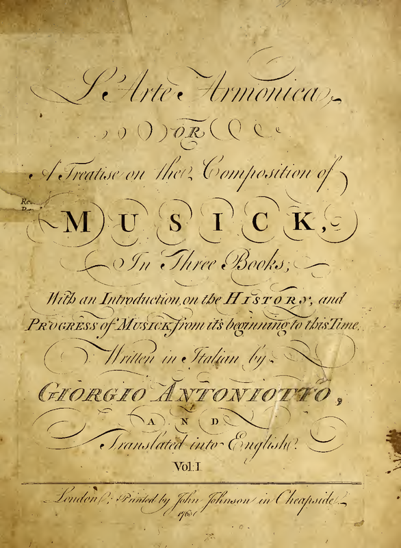 | Alternative. Title | L'Arte Armonica, or A Treatise on the Composition of Musick, In Three Books; with an Introduction on the History, and Progress of Musick, from its beginning to this Time. Written in Italian by Giorgio Antoniotto, and Translated into English. |