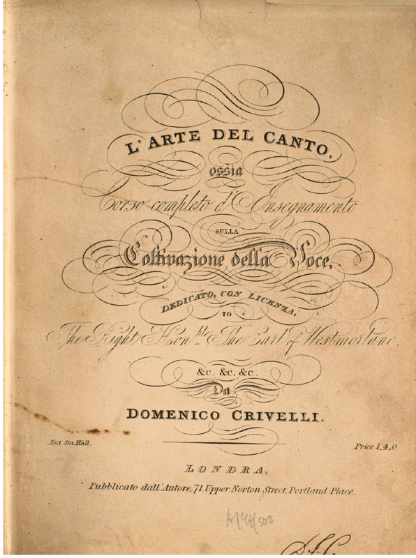 | Alternative. Title | L'Arte del Canto, ossia Corso completo d'Insegnamento sulla Coltivazione della Voce. The Art of Singing; Instructions and Progressive Exercises in the Art of Singing, with Scales, Solfeggios, Variations, Etc. by D. Crivelli |