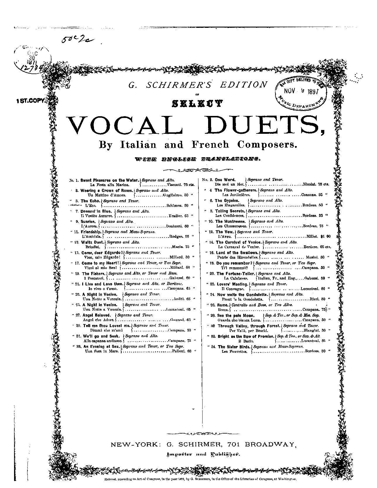 Attributed by the University of Pennsylvania libraries (which has an earlier edition, with the name "A. Schimon" on the score) to Anton Schimon instead. The attribution by Millard and Schirmer in 1871 to Adolf Schimon may have been a mistaken guess. So attribution here questionable...