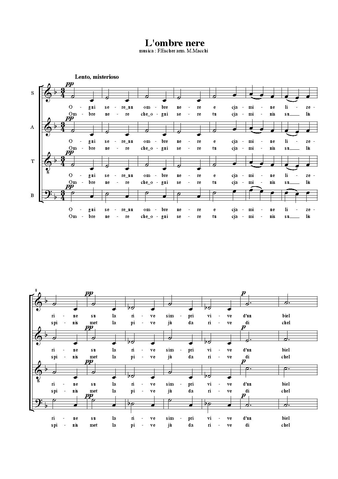 Apart from collecting folk songs, Escher also composed villotte, specifically for choirs, along the lines of popular Friulian songs, so this is likely male chorus rather than solo voices. Mr. Macchi's arrangement says "arm. M. Macchi". It is unclear what the nature of the harmonization is that would be different from Escher's original; perhaps the only difference is that it is for mixed chorus rather than male chorus.