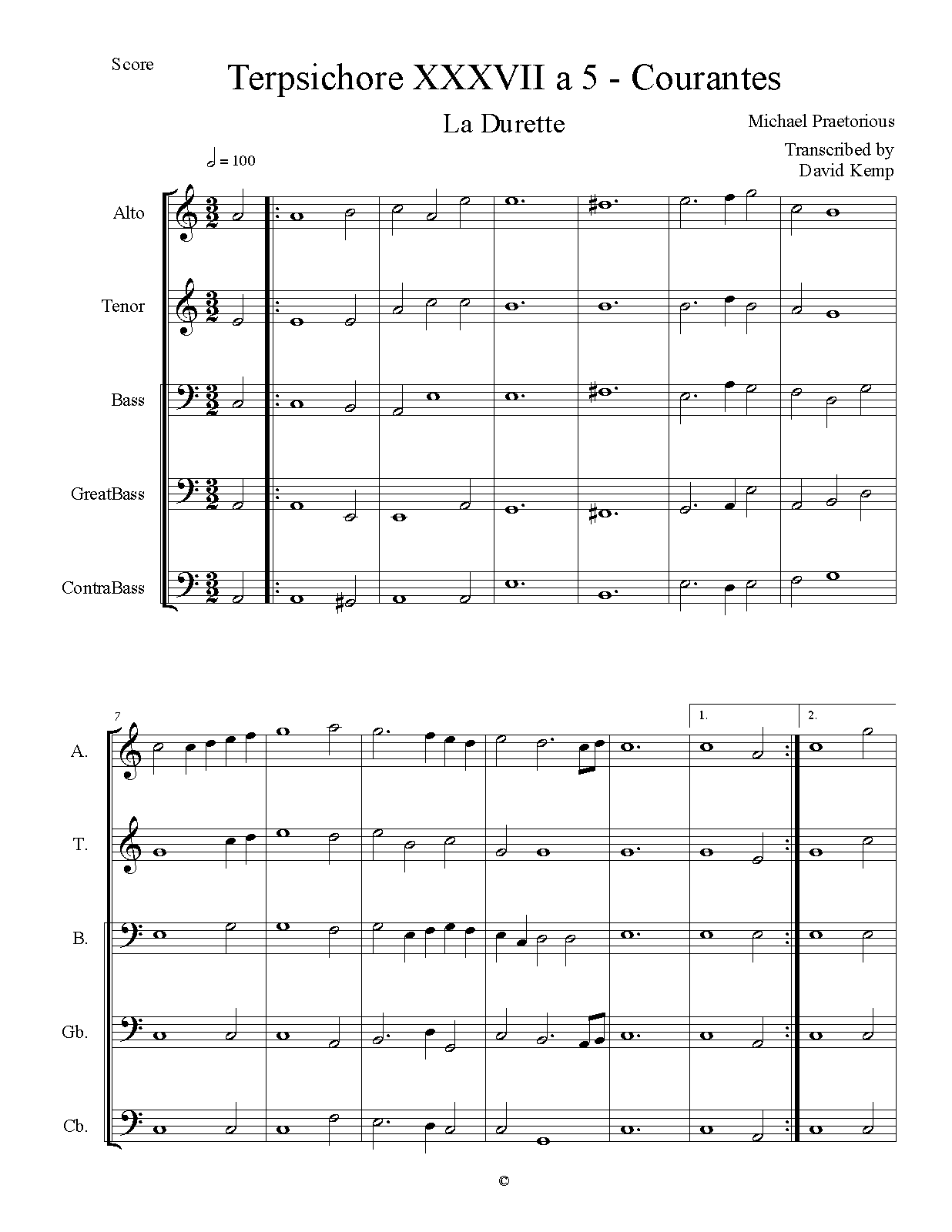 | Extra Information | These pieces were assembled and arranged by Praetorius for his 1612 collection. It is unknown how many, or if any, of the works in the collection were actually composed by Praetorius as opposed to being popular dance tunes arranged by him. The instrumentation is not specified in the original, and simply listed as "à 5". |
