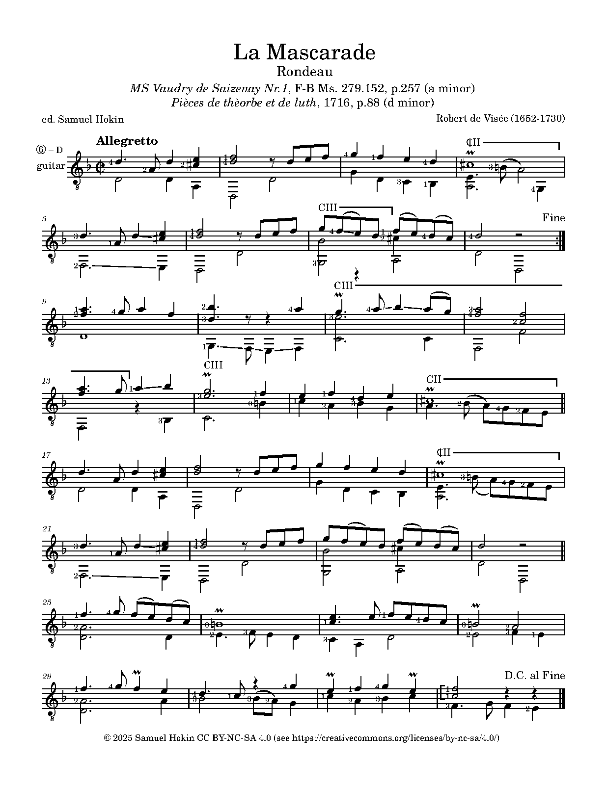 This piece survives in the Vaudry de Saizenay manuscript (written 1699–?) in theorbo tablature (in a minor) and in the 1716 staff edition Pièces de théorbe et de luth by Robert de Visée (in d minor). The Saizenay version preserves a strong, continuous bass line characteristic of theorbo writing, while the keyboard edition transposes and adapts textures for keyboard performance. These features suggest the work originates in the theorbo idiom, though the direction of transmission cannot be demonstrated conclusively. This guitar transcription derives mainly from the theorbo version, but includes some textures from the keyboard version.