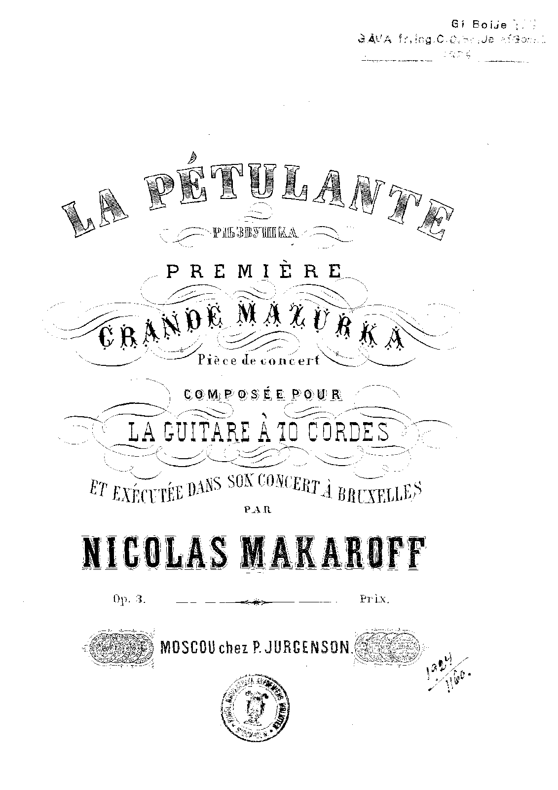 | Alternative. Title | Première Grande Mazurka. Piece de concert composée pour la guitare à 10 cordes et éxécutée dans son concert à Bruxelles |
