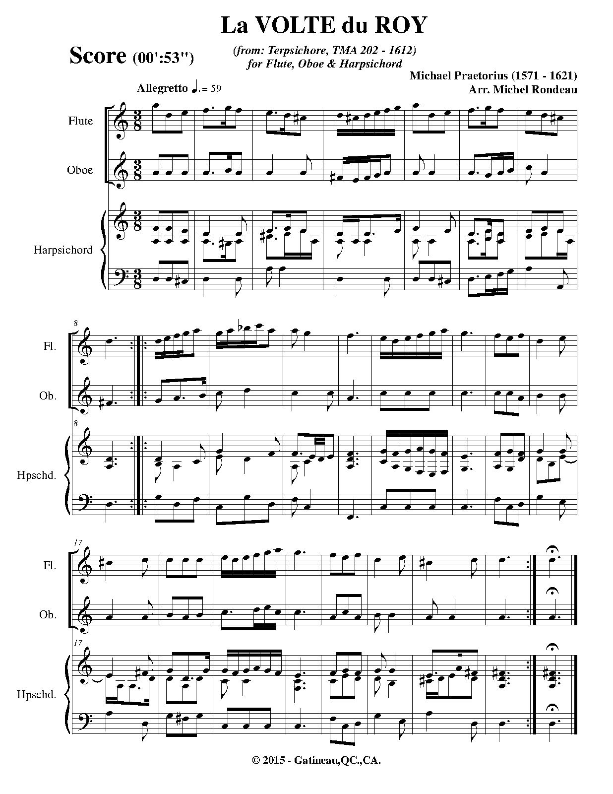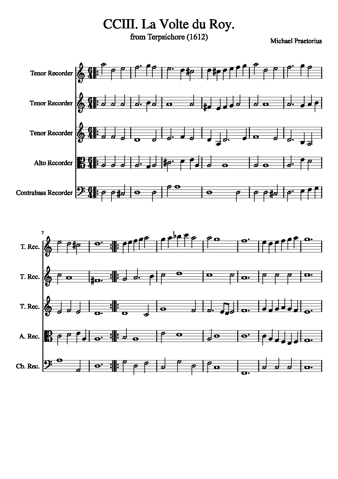 | Extra Information | These pieces were assembled and arranged by Praetorius for his 1612 collection. It is unknown how many, or if any, of the works in the collection were actually composed by Praetorius as opposed to being popular dance tunes arranged by him. The instrumentation is not specified in the original, and simply listed as "à 5". |