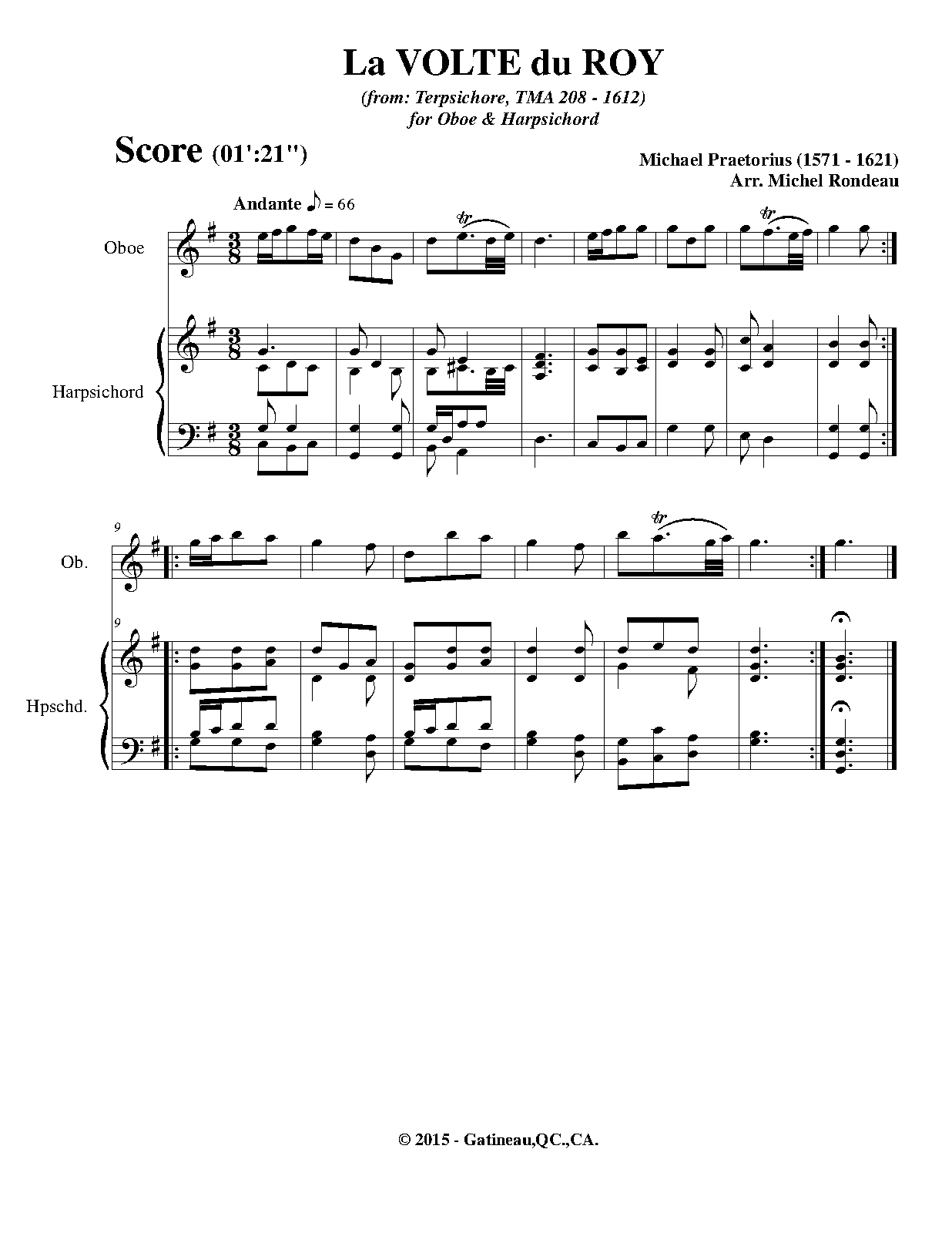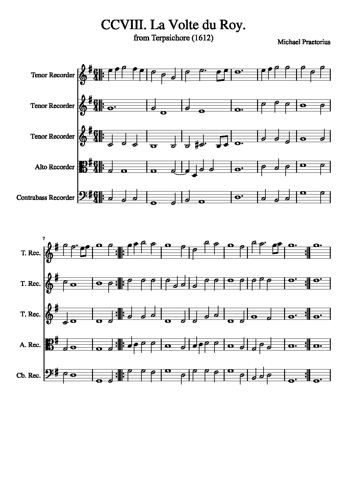 | Extra Information | These pieces were assembled and arranged by Praetorius for his 1612 collection. It is unknown how many, or if any, of the works in the collection were actually composed by Praetorius as opposed to being popular dance tunes arranged by him. The instrumentation is not specified in the original, and simply listed as "à 5". |