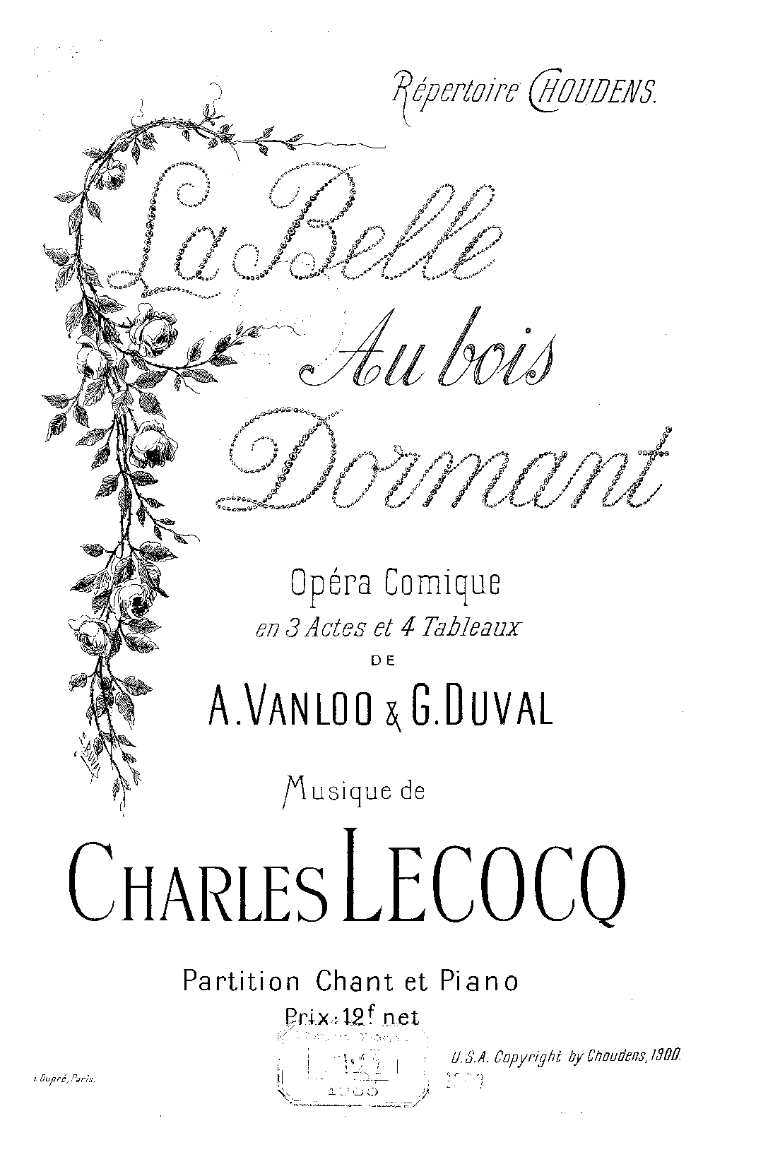 | Copyright Information | Publication noted in the Bibliographie de la France : 89e année, 2e série, Nº 13, 31 Mars 1900, p.223, reg.1373 (vocal score). |