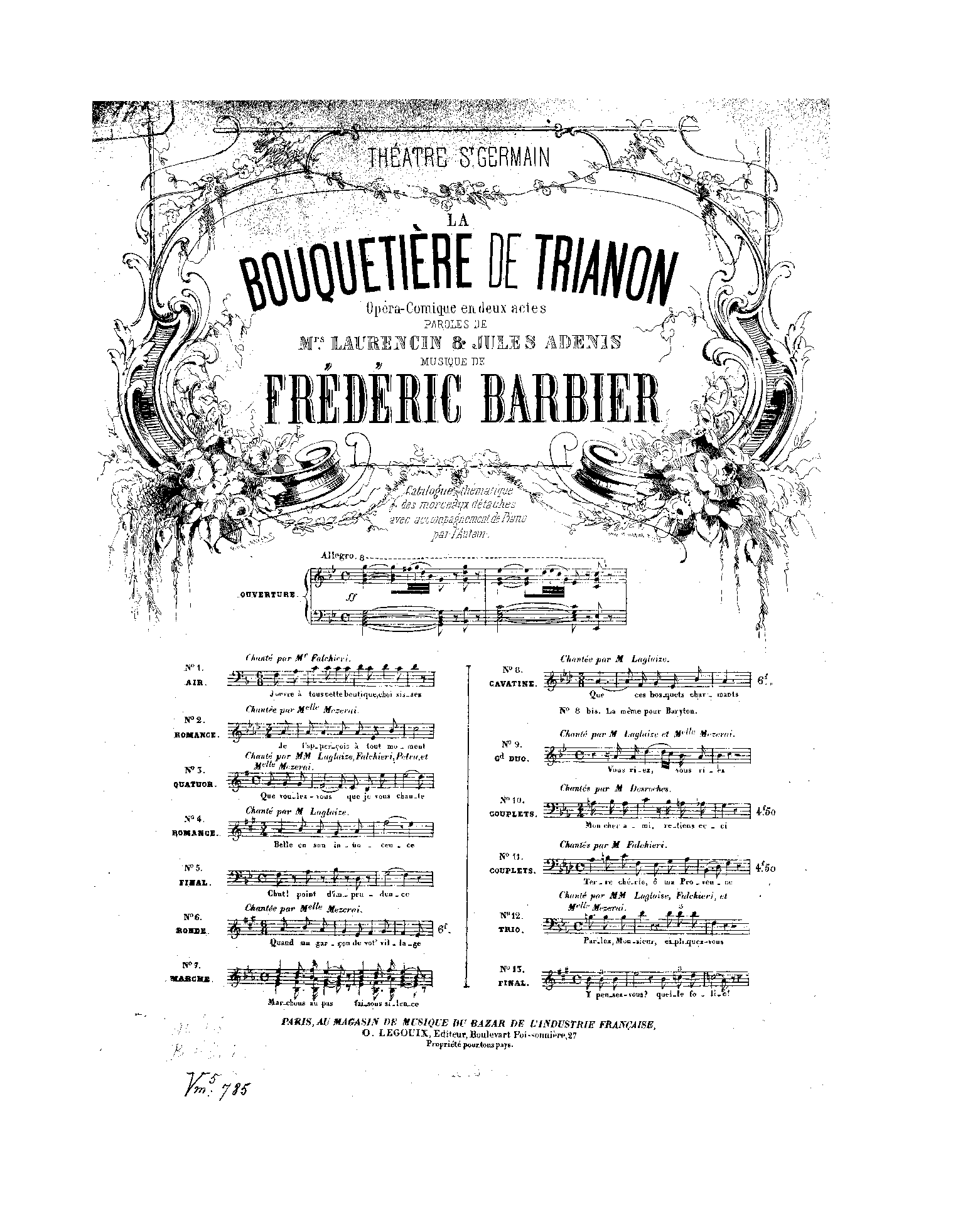 | Copyright Information | Publication noted in the Bibliographie de la France : 54e année, 2e série, Nº 5, 4 Février 1865, p.53, reg.230 (vocal score). |
