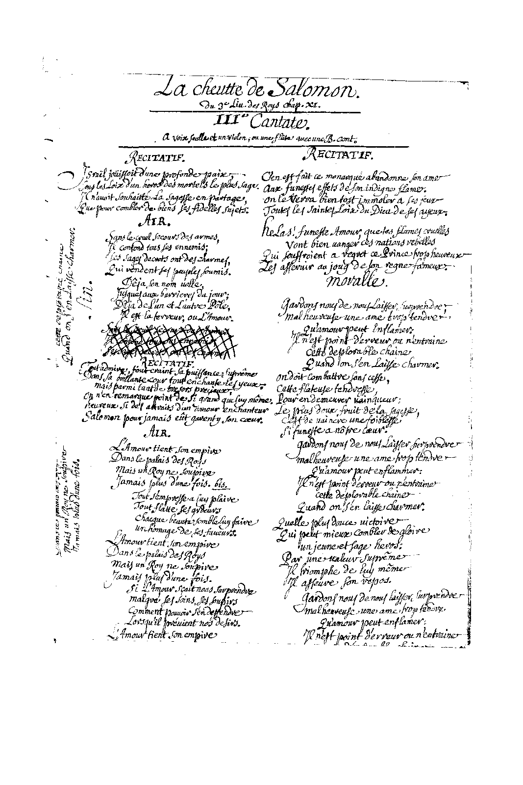 Score extracted from a manuscript book including 5 others cantatas : "Abraham ou le sacrifice d'Isaac", "Samson trahi par Dalila", "Judith ou la mort d'Holopherne", "Les trois enfants de la fournaise" & the incomplete "Baltassar"