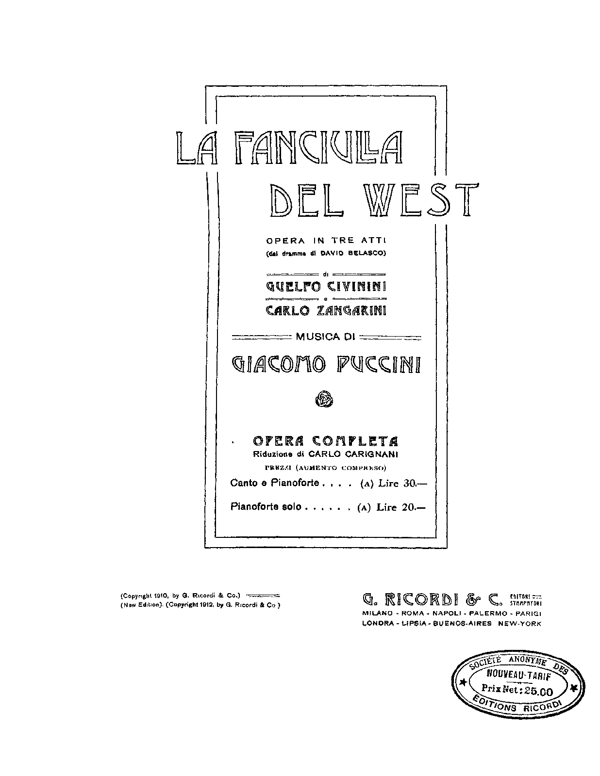 Publisher. Info. Milan: G. Ricordi & C., 1912. Plate 113400.