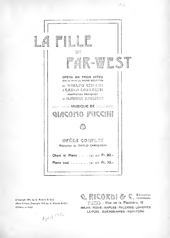 Publisher. Info. Paris: G. Ricordi & C., 1912. Plate 113850.