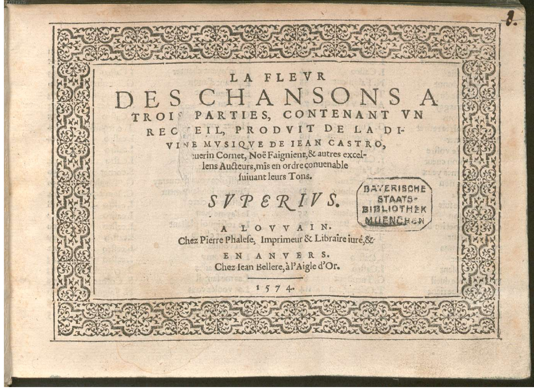 La fleur des chansons a trois parties, contenant un recueil, produit de la divine musique de Jean Castro, Severin Cornet, Noë Faignient, & autres excellens Aucteurs, mis en ordre convenable suiviant leurs Tons. A Lovvain. Chez Pierre Phalese, Imprimeur & Libraire Jure, & En Anvers. Chz Jean Bellere, a l'Aigle d'Or. 1574.